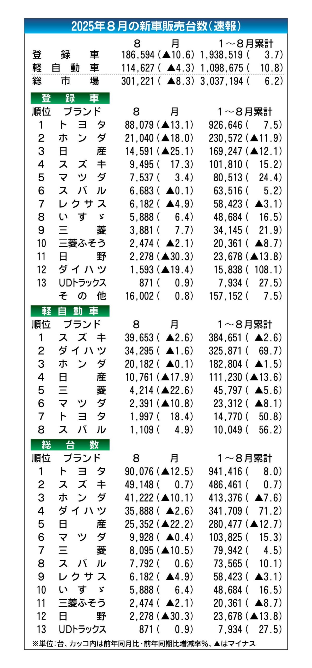 2025年8月の国内新車販売、2カ月連続マイナス 値上げ・長納期化・受注停止が影響