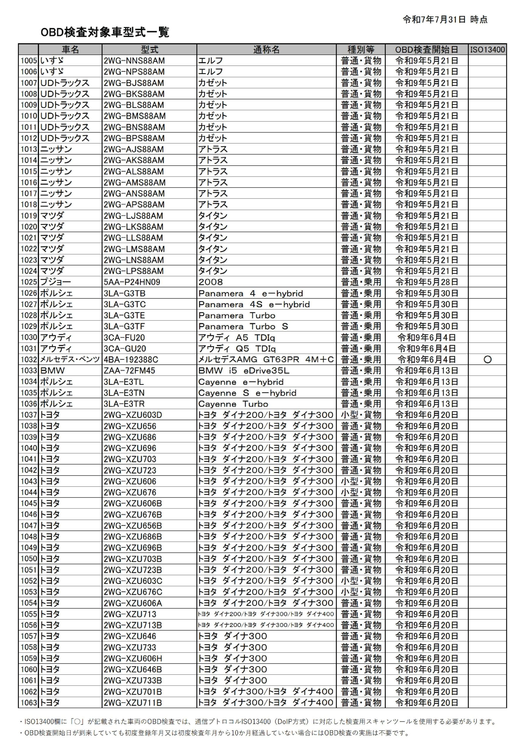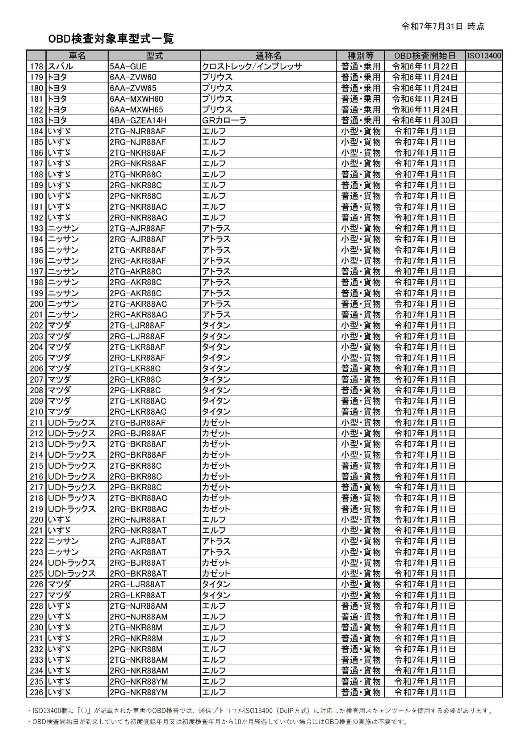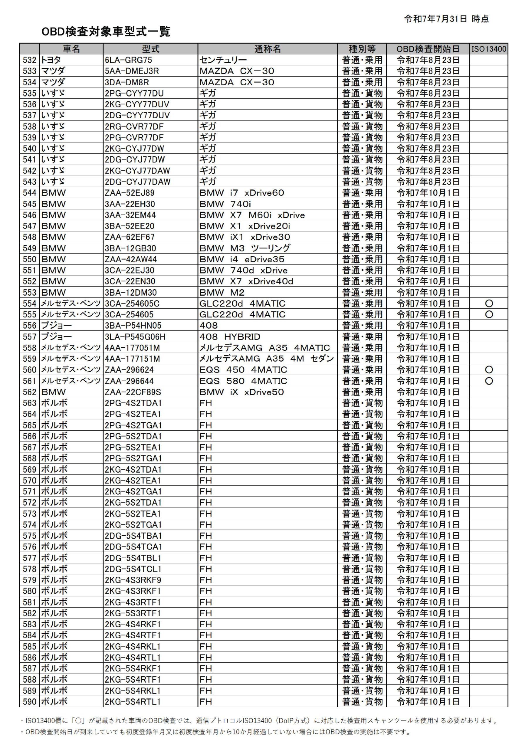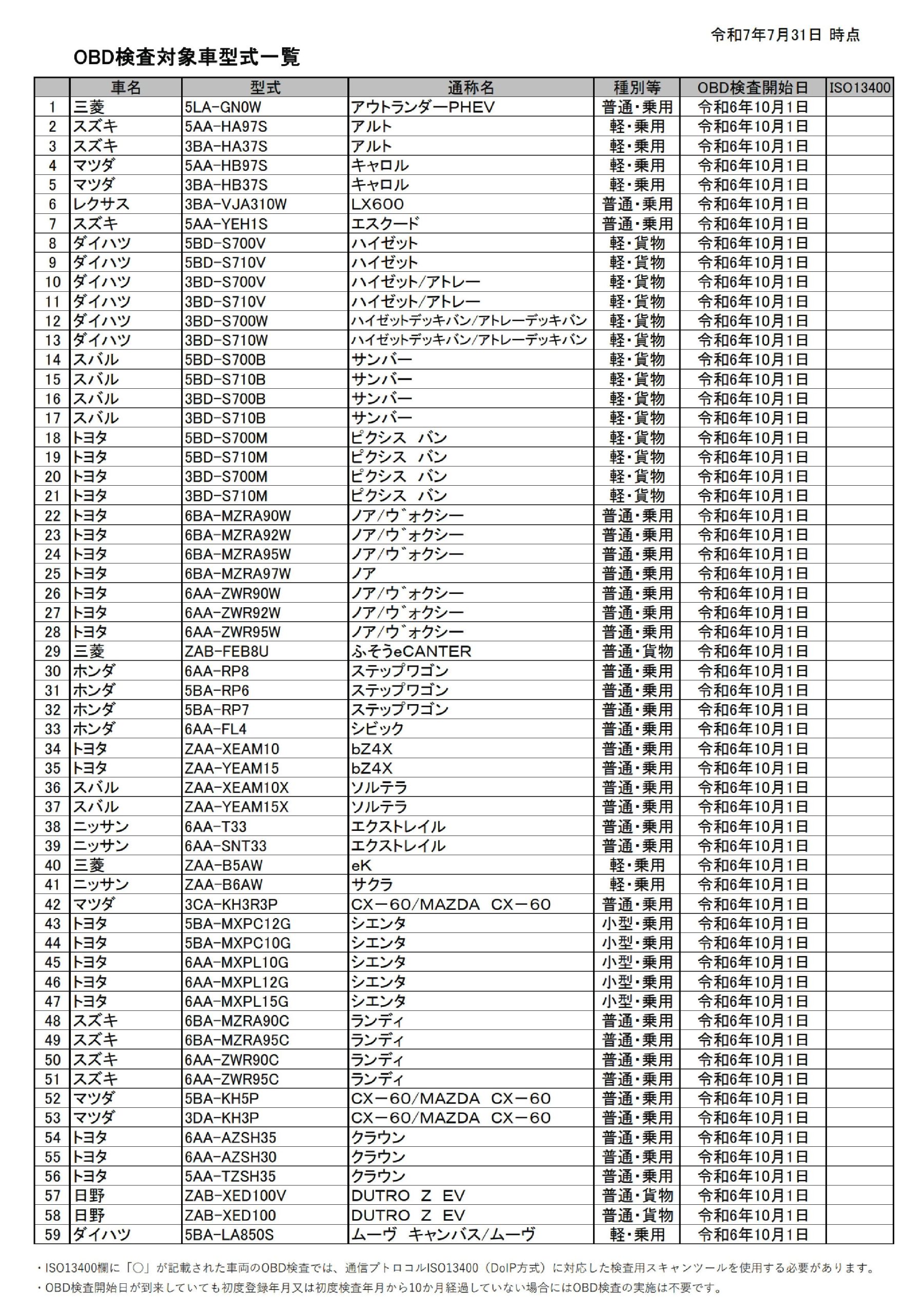〈OBD検査〉対象車種の型式一覧(2025/7/31現在)