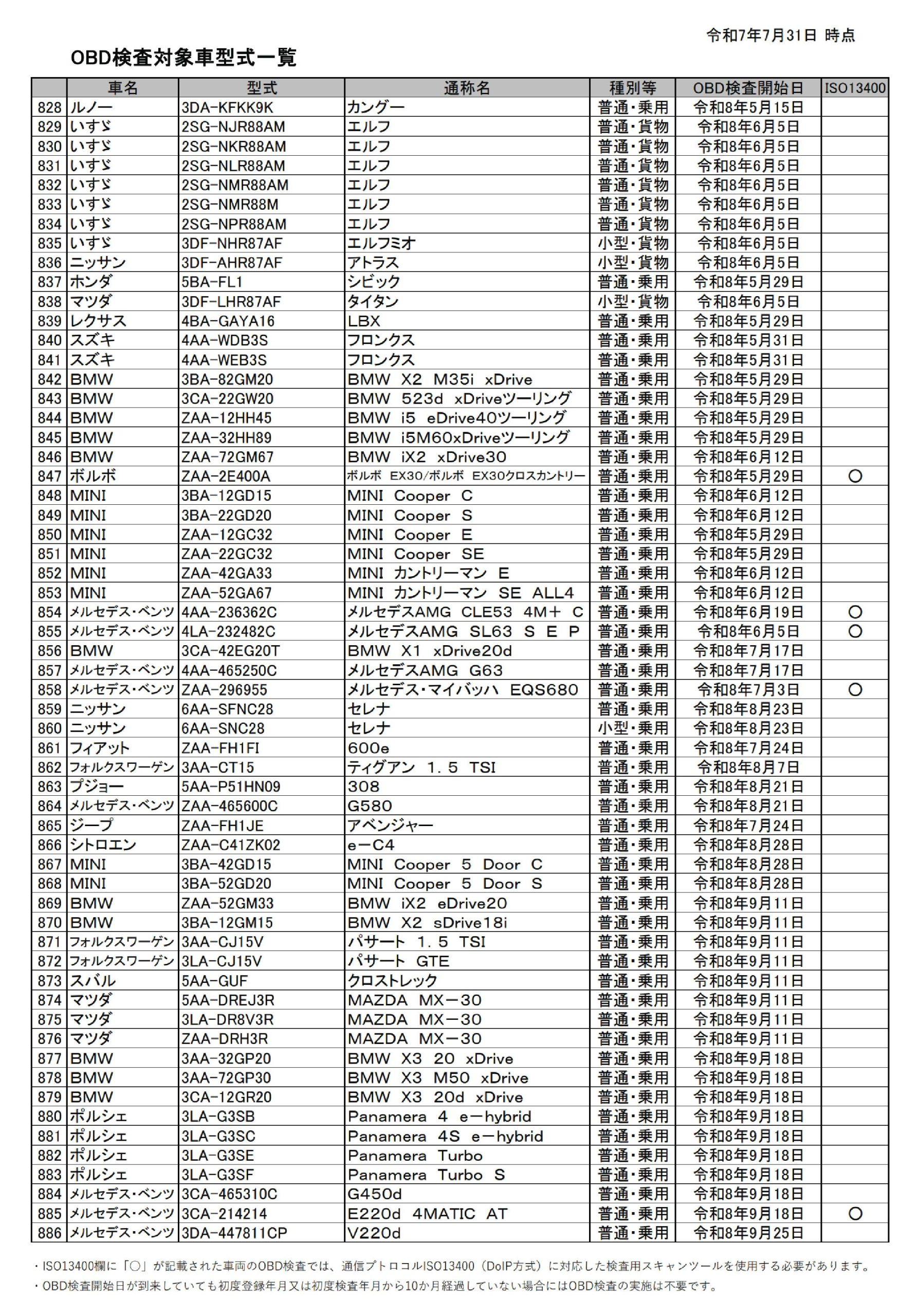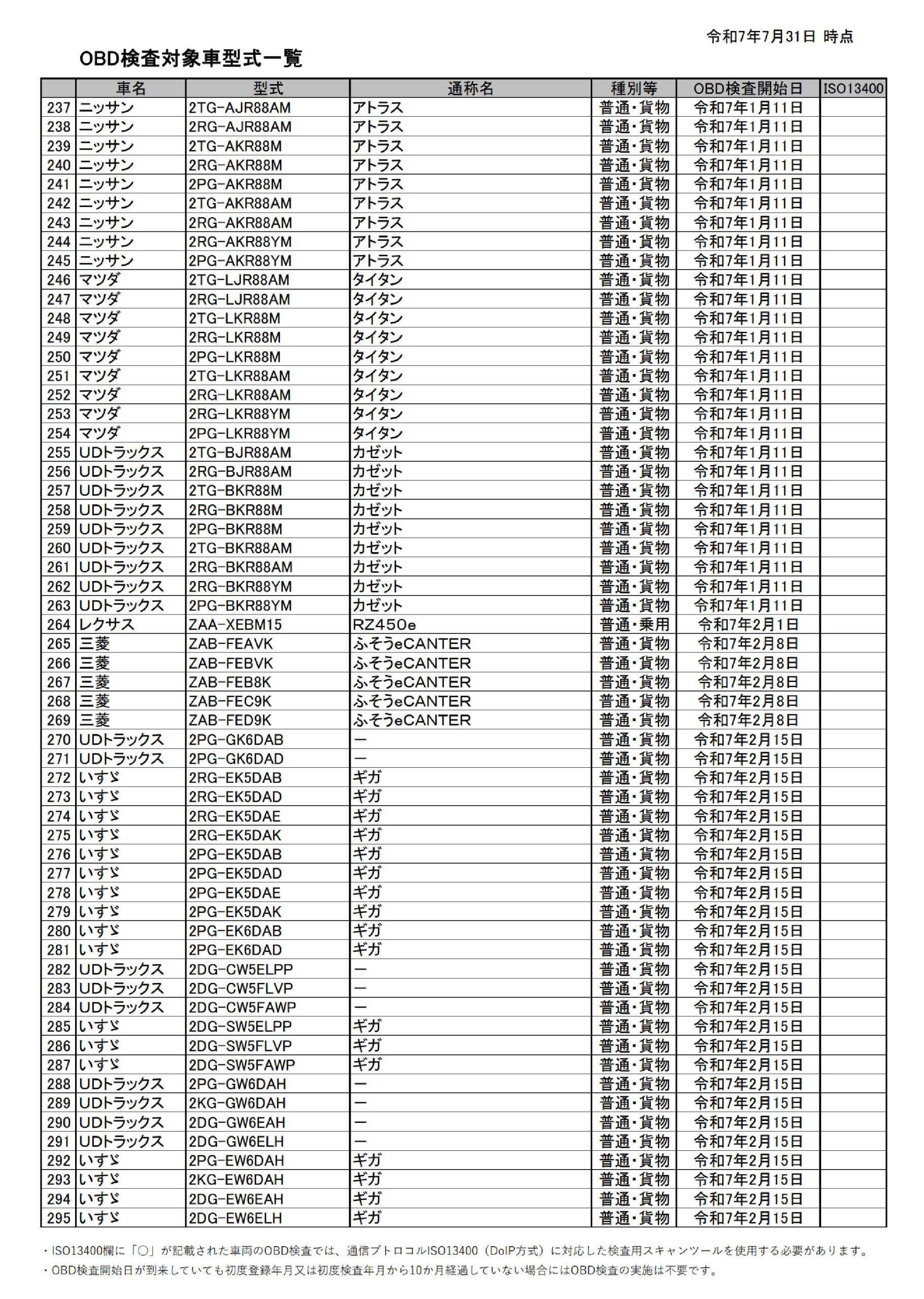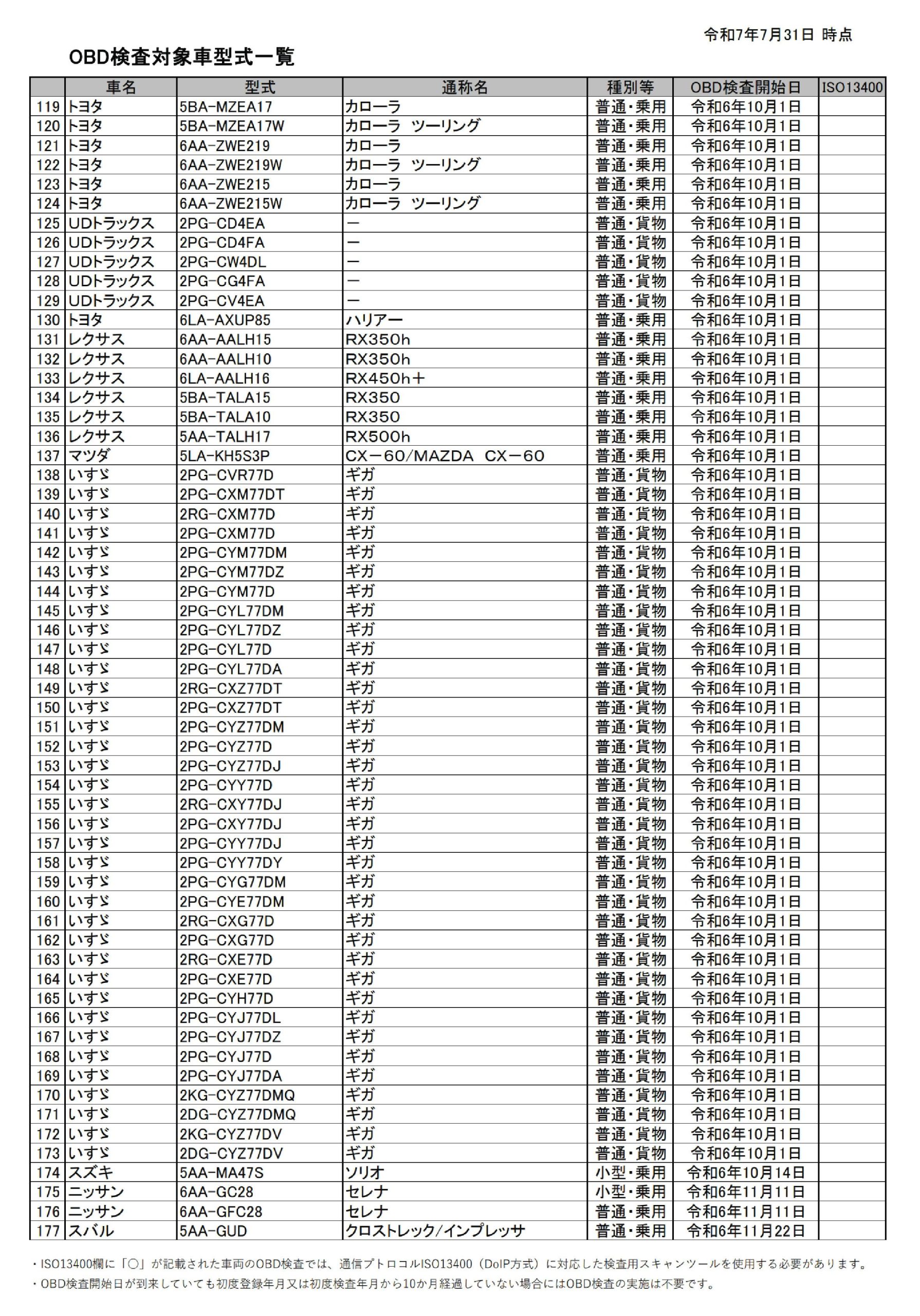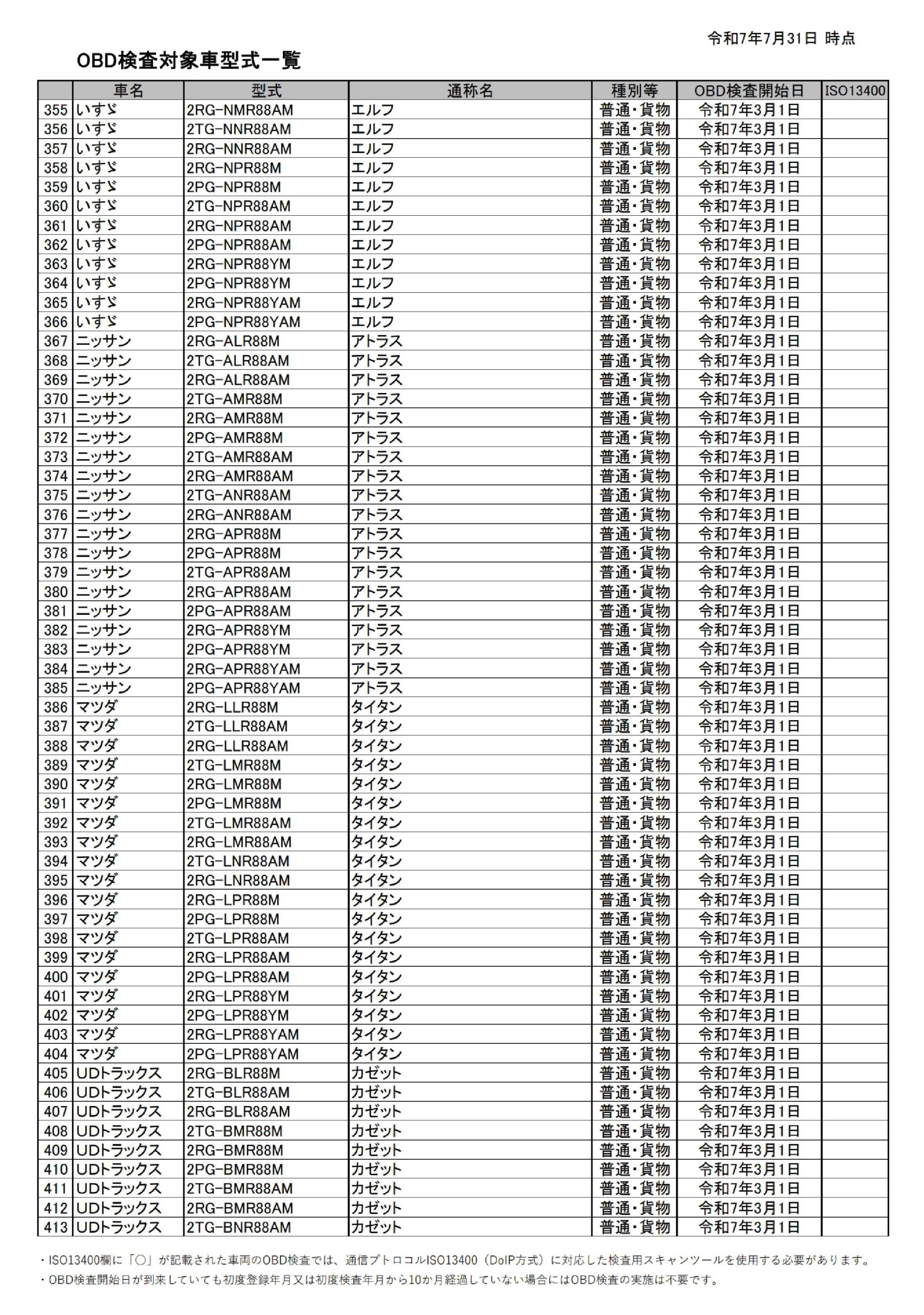 〈OBD検査〉対象車種の型式一覧(2025/7/31現在)
