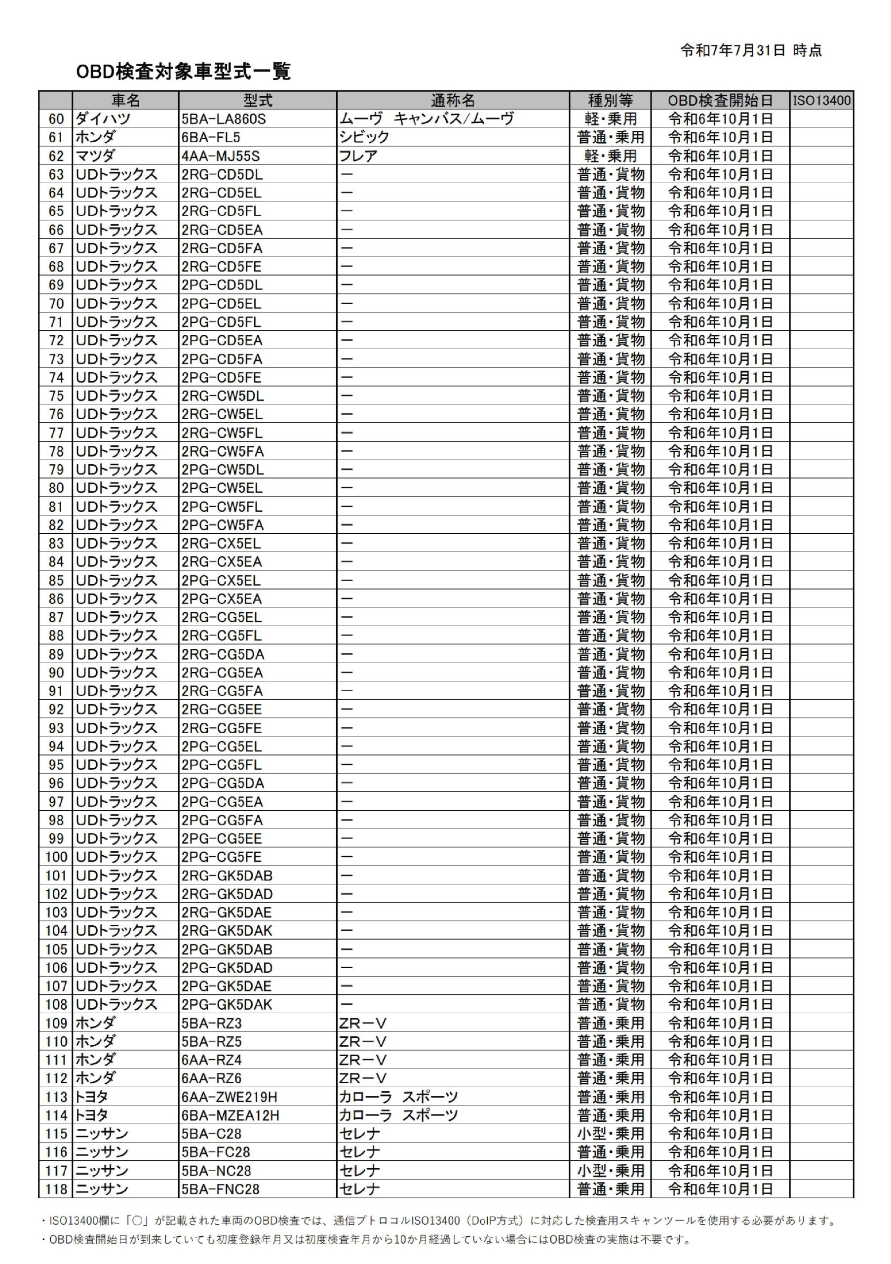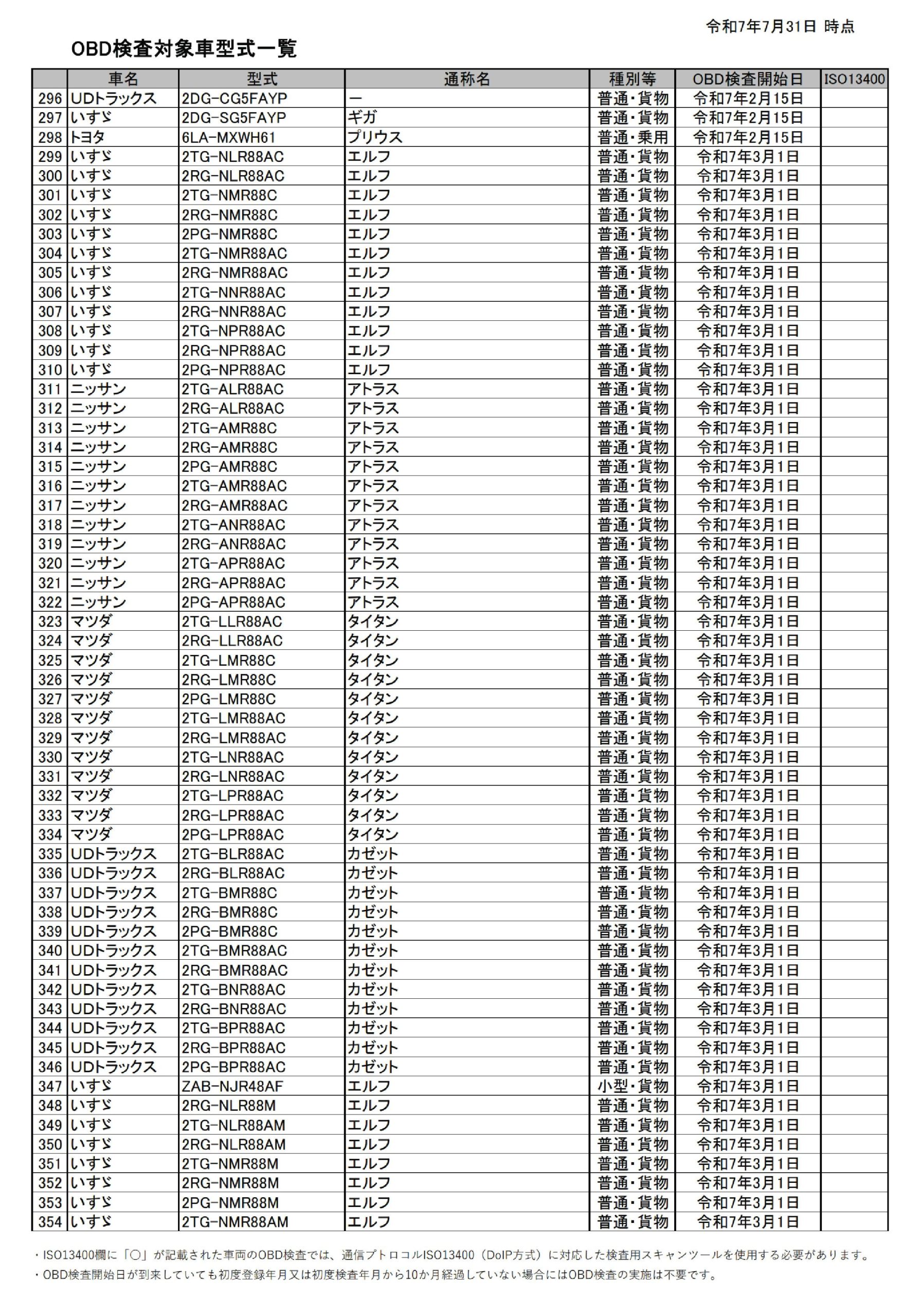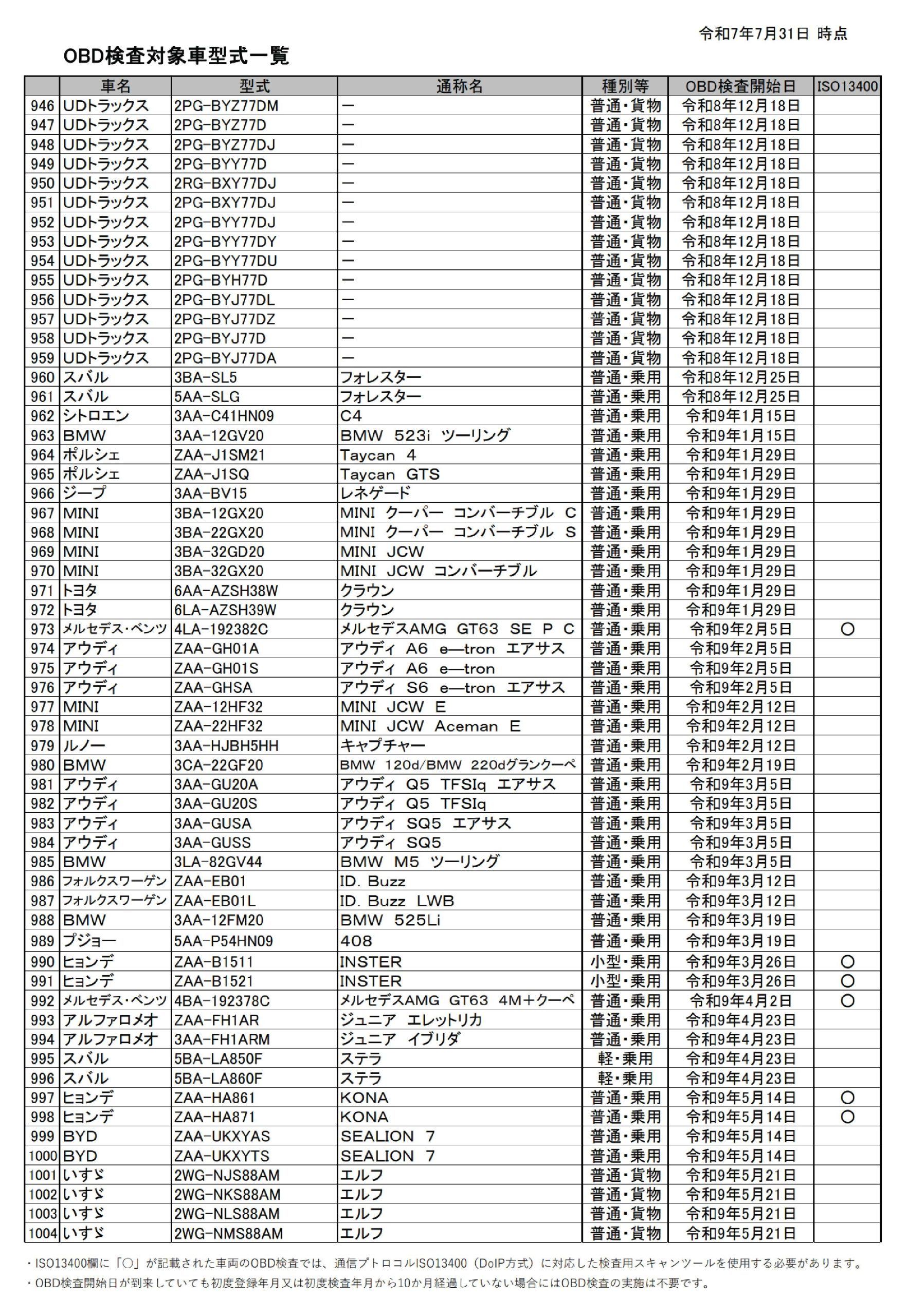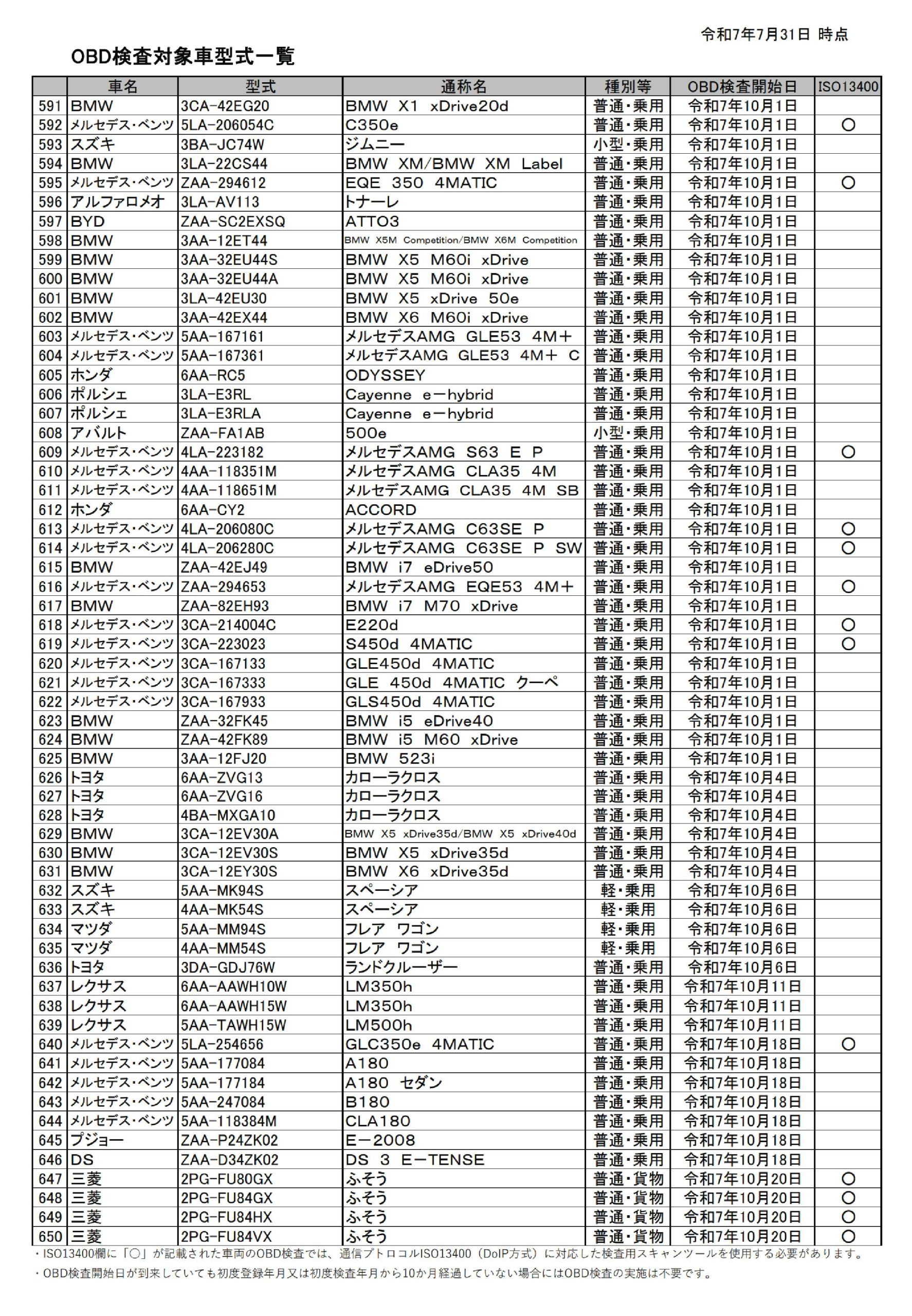 〈OBD検査〉対象車種の型式一覧(2025/7/31現在)