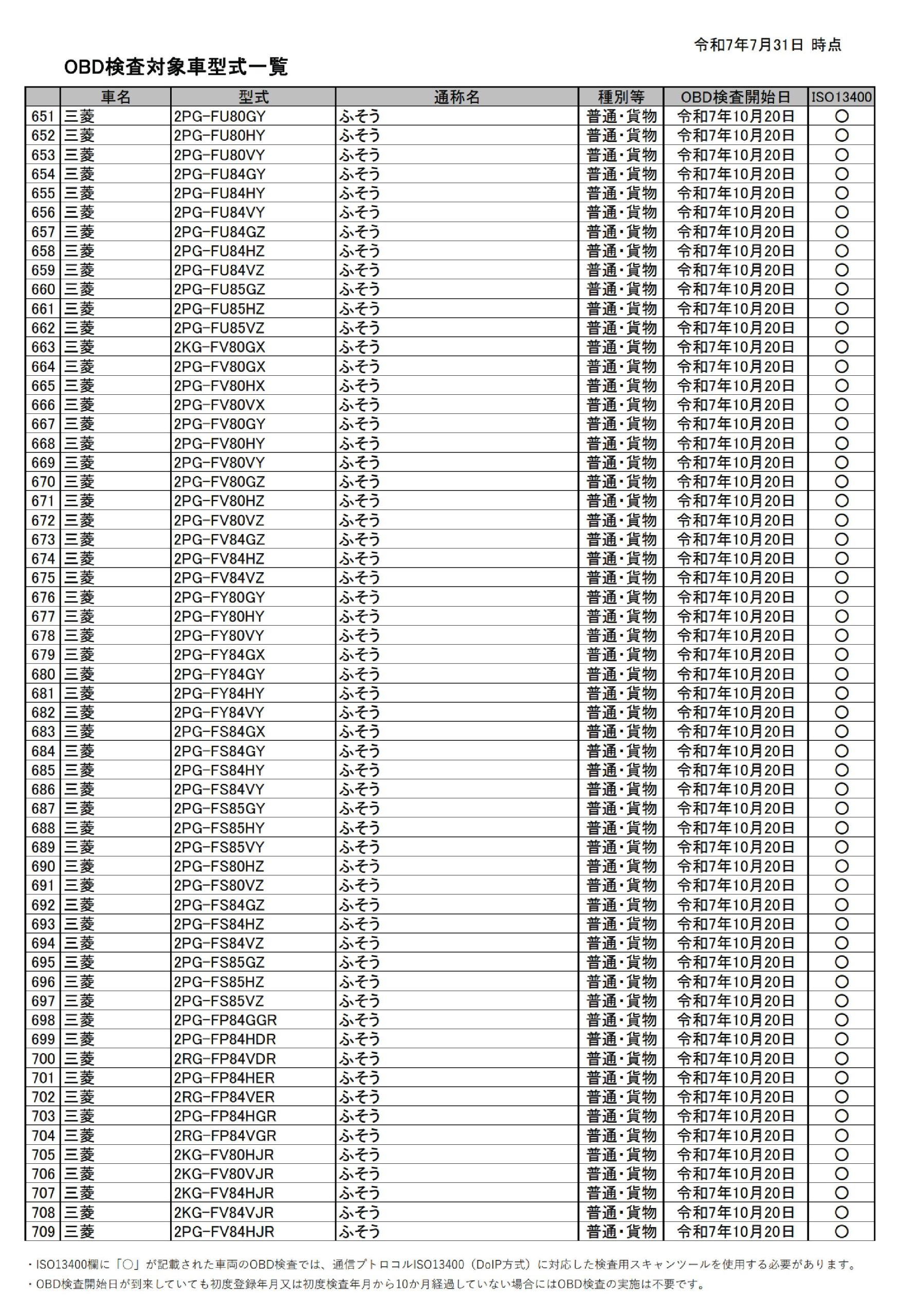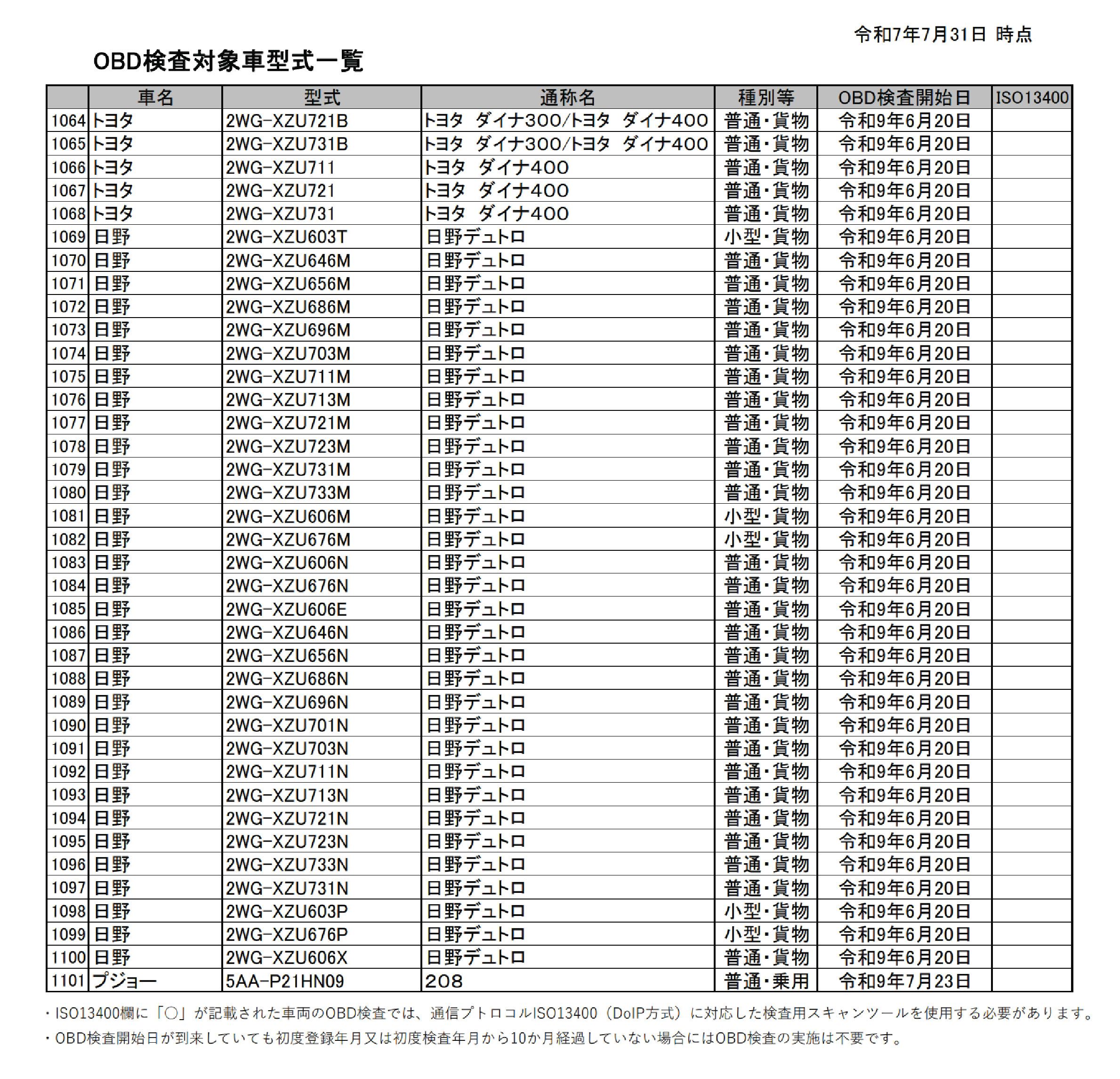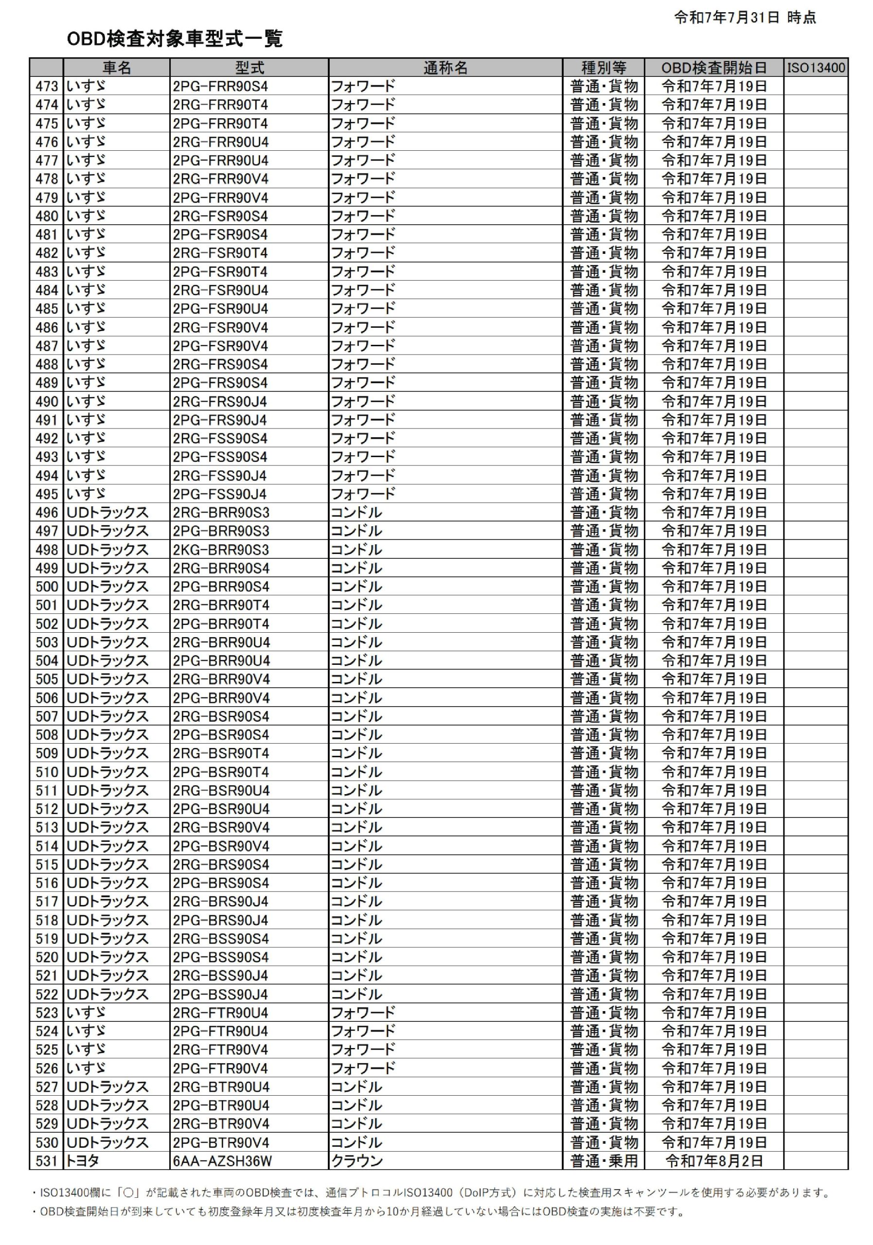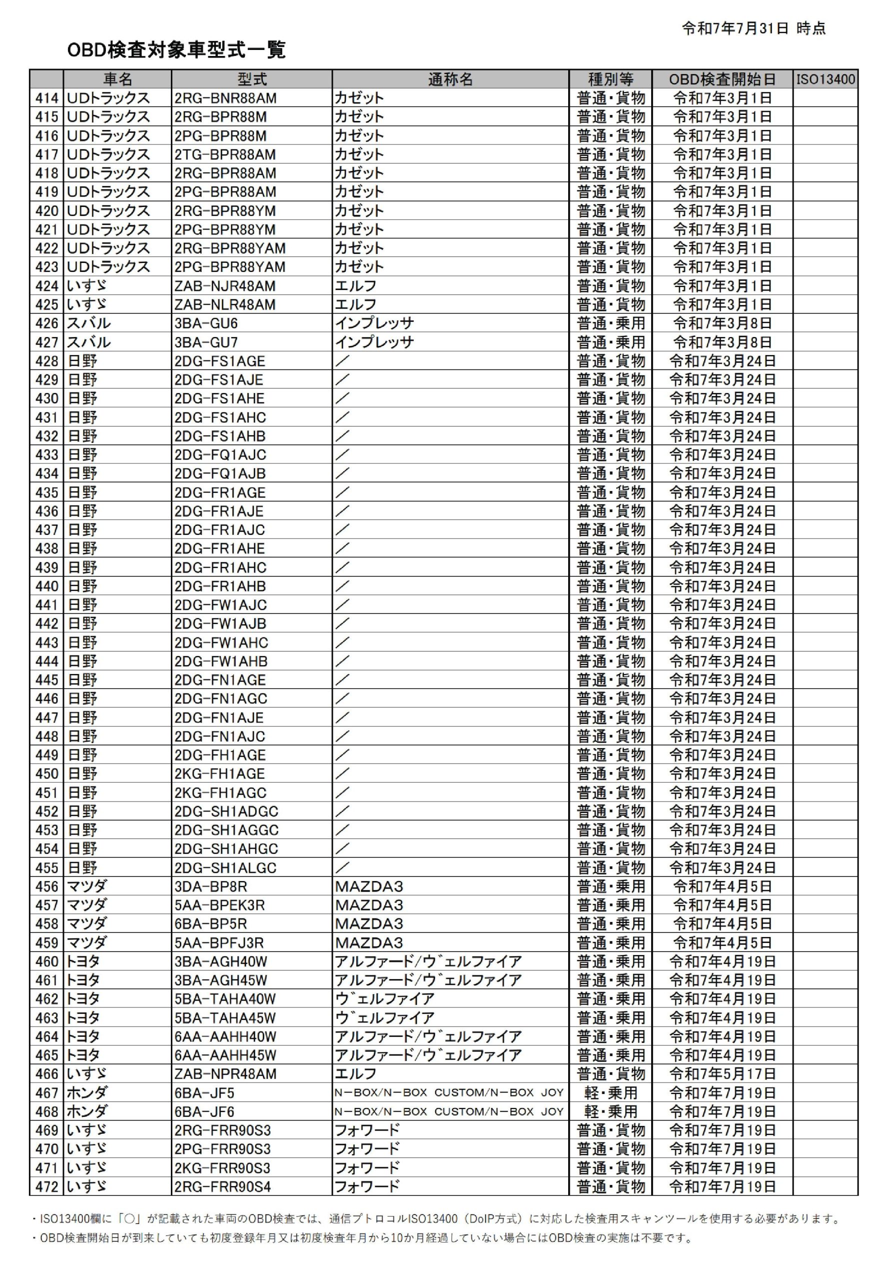 〈OBD検査〉対象車種の型式一覧(2025/7/31現在)