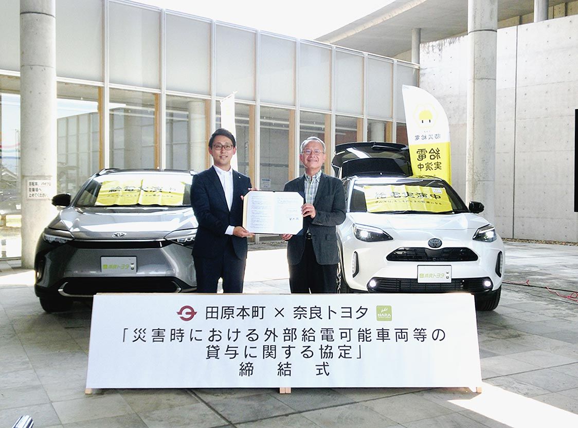 【奈良】奈良トヨタ(菊池攻社長)は、田原本町(高江啓史町長)と「災害時における外部給電可能車両等の貸与に関する協定」を締結した。災害時に同社の給電機能を備えた車両を田原本町に貸与し、電力供給を確保することを目的とする。平時においても防災訓...