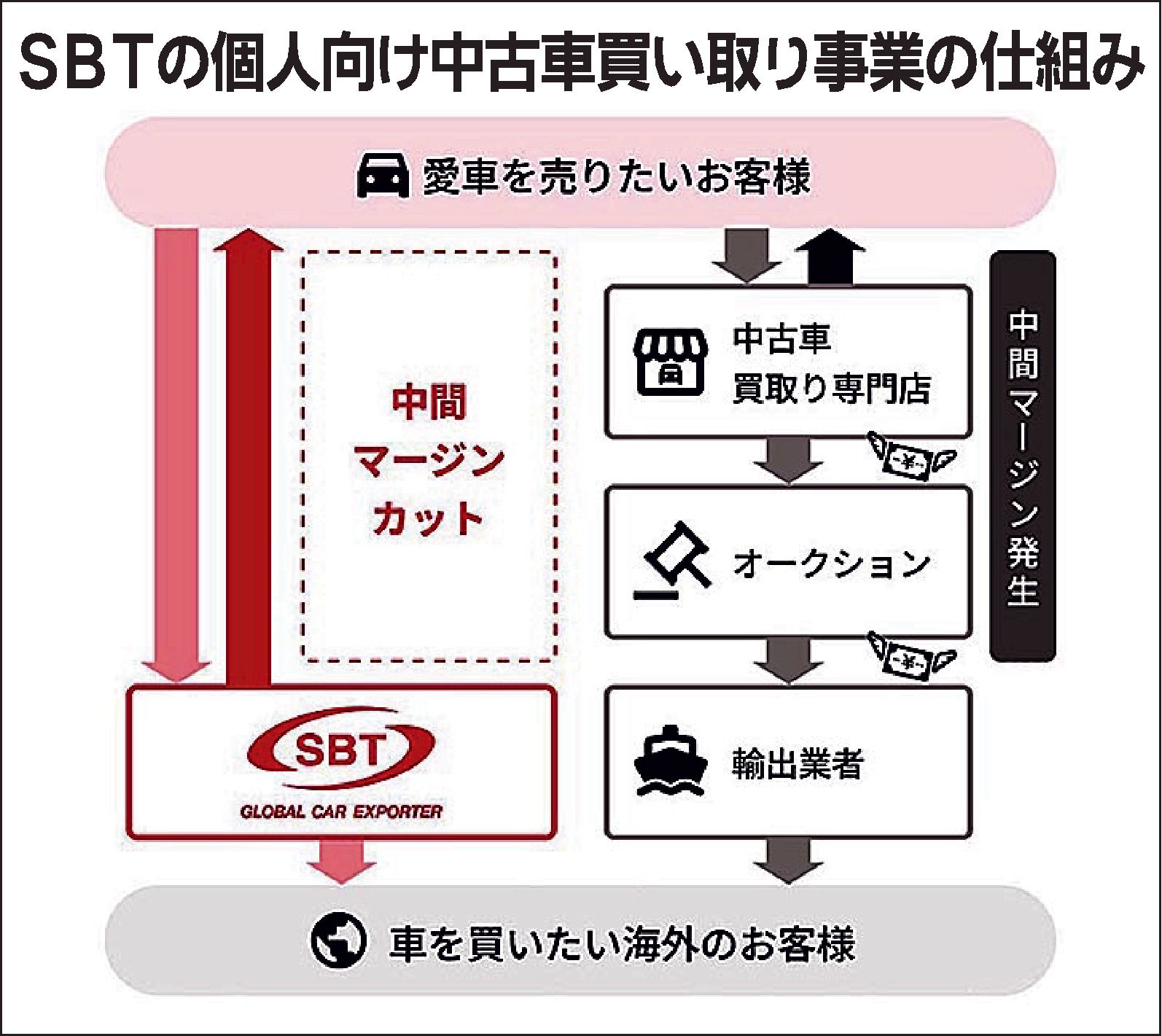 中古車輸出のエスビーティー(SBT、稲見太郎社長、横浜市神奈川区)は、個人向けの中古車買い取り事業を始めたと発表した。無料通信アプリ「LINE(ライン)」を通じて同社との連絡や車両の査定などを完結できる仕組み。一般的な買い取りと比べて電話...