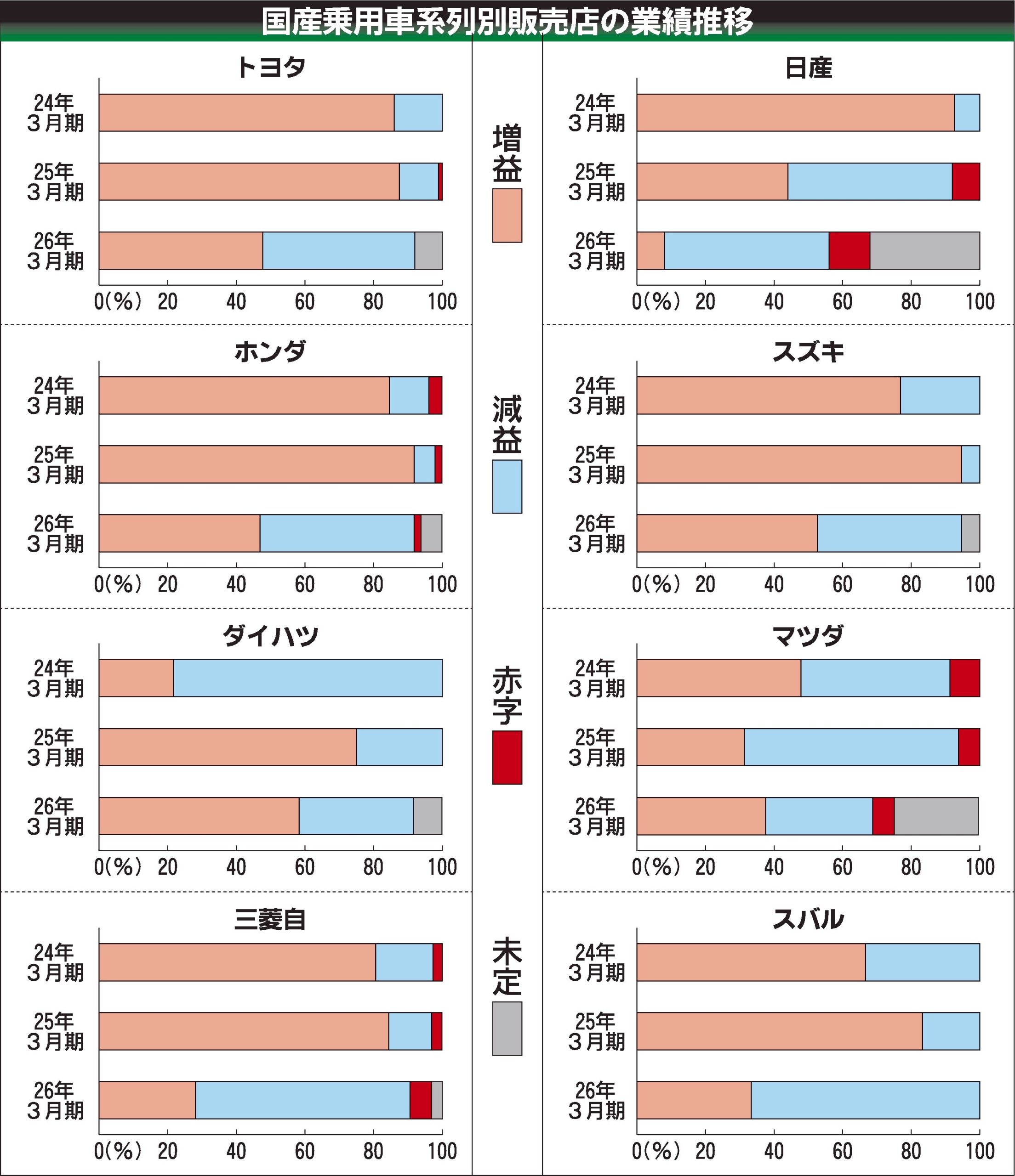 新車ディーラーの業績格差が系列間で広がっている。日刊自動車新聞が全国の新車ディーラーを対象に行ったアンケート調査によると、25年3月期の最終損益はスズキ系やホンダ系、トヨタ系、ダイハツ系などで増益だった会社の割合が増えた。ダイハツ系は認証...