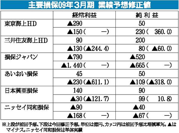 損害保険各社が2009年3月期の業績予想を相次いで下方修正した。業界2位の三井住友海上グループホールディングス(HD)は、前回予想で90億円とした経常利益を130億円の赤字に修正。業界3位の損害保険ジャパンは経常赤字が790億円から144...