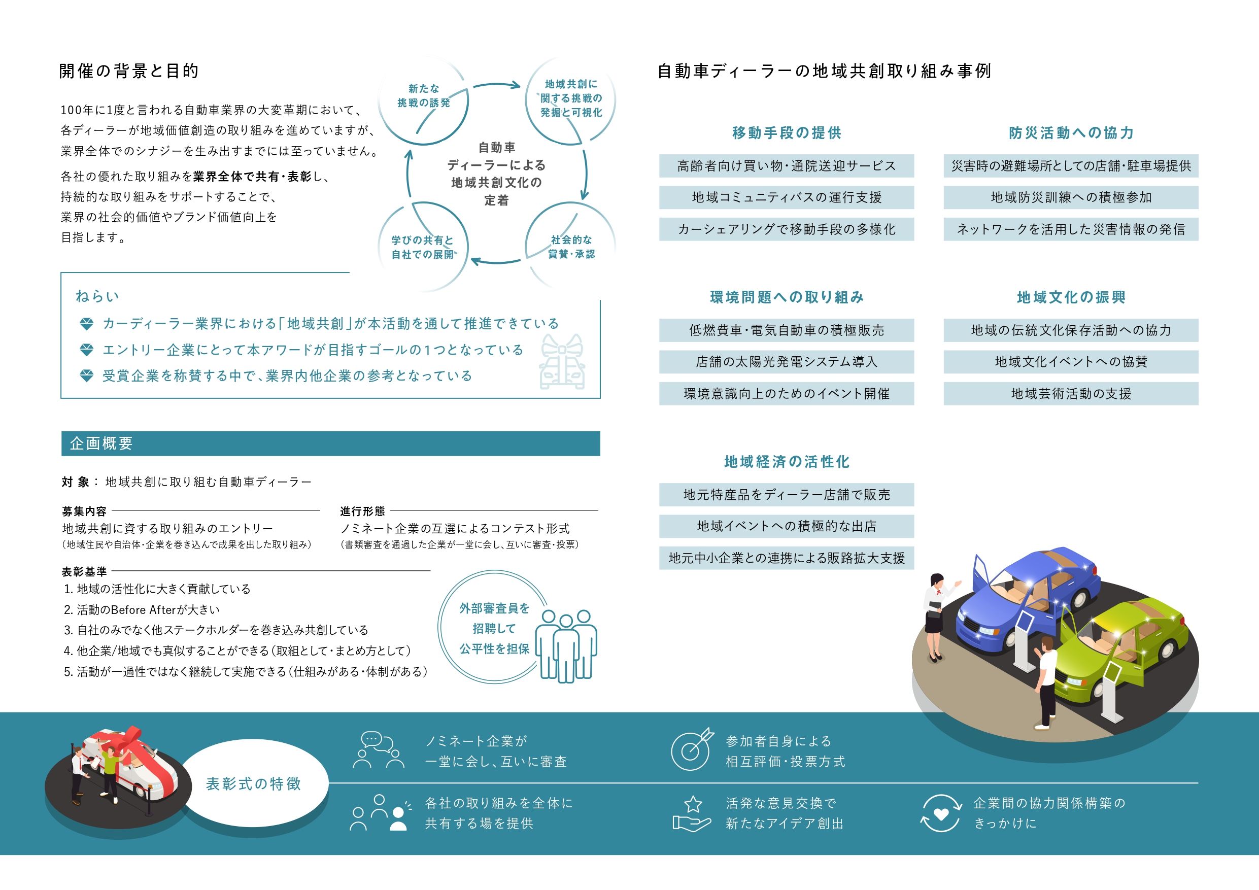 日刊自動車新聞社は、リブ・コンサルティングと共催で「自動車ディーラー 地域共創アワード」を立ち上げました。本アワードは、地元地域・エリアの活性化に向け地域住民や自治体・企業とともに共創し継続的な取り組みを行う「自動車ディーラー」を表彰する制度です。地域社会の一員として持続可能な社会の実現に向けて取り組んでいることを広く周知し、地域資源の活用などを通して業界内外の活性化につなげることを目的としています。ぜひ、貴社・貴店が取り組む活動をご応募ください。