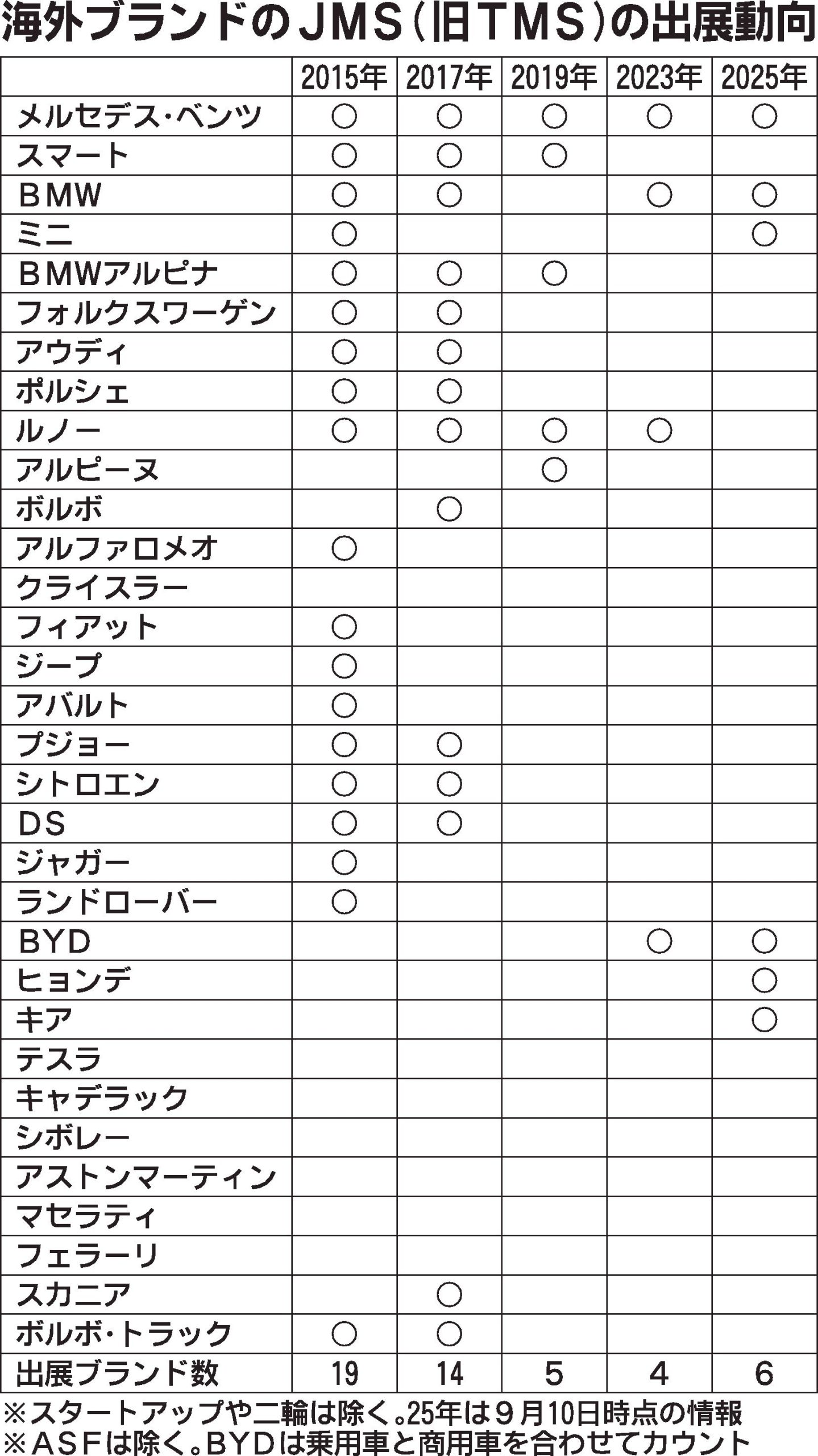 インポーター勢が「ジャパンモビリティショー(JMS)」への関心を高め始めている。日本自動車工業会(自工会、片山正則会長)が10日発表した出展企業によると、2025年開催の海外ブランド(スタートアップ、二輪車除く)の出展数は6ブランド。前回...