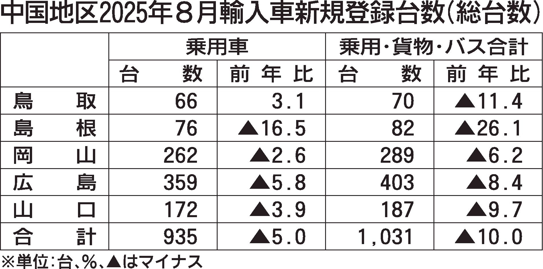 日本自動車輸入組合(JAIA)の発表によると、8月の中国地区の輸入車新規登録台数(外国メーカー車と日本メーカー車)は、前年同月比10.0%減の1031台で8カ月ぶりにマイナスに転じた。中国5県すべてで対前年でマイナスとなり、外国メーカー車...