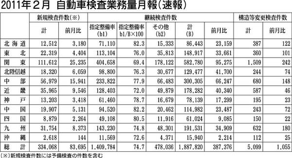 国土交通省は、2011年2月の自動車検査業務量(速報)をまとめた。全国の新規検査件数は前月比8万3695件増の33万4068件、継続検査件数は同38万7376件増の188万7820件となった。指定整備率は増減なしの74・7%。構造等変更検...
