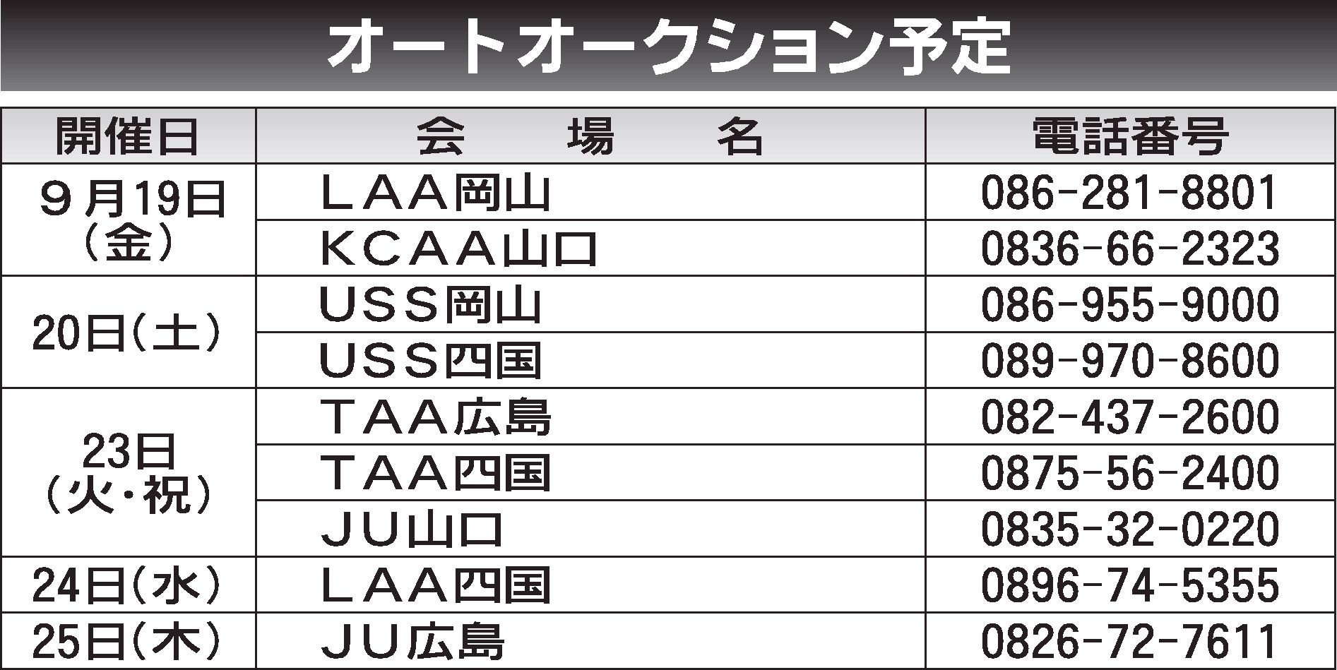 〈オートオークション予定〉中・四国地区 2025/9/19~25