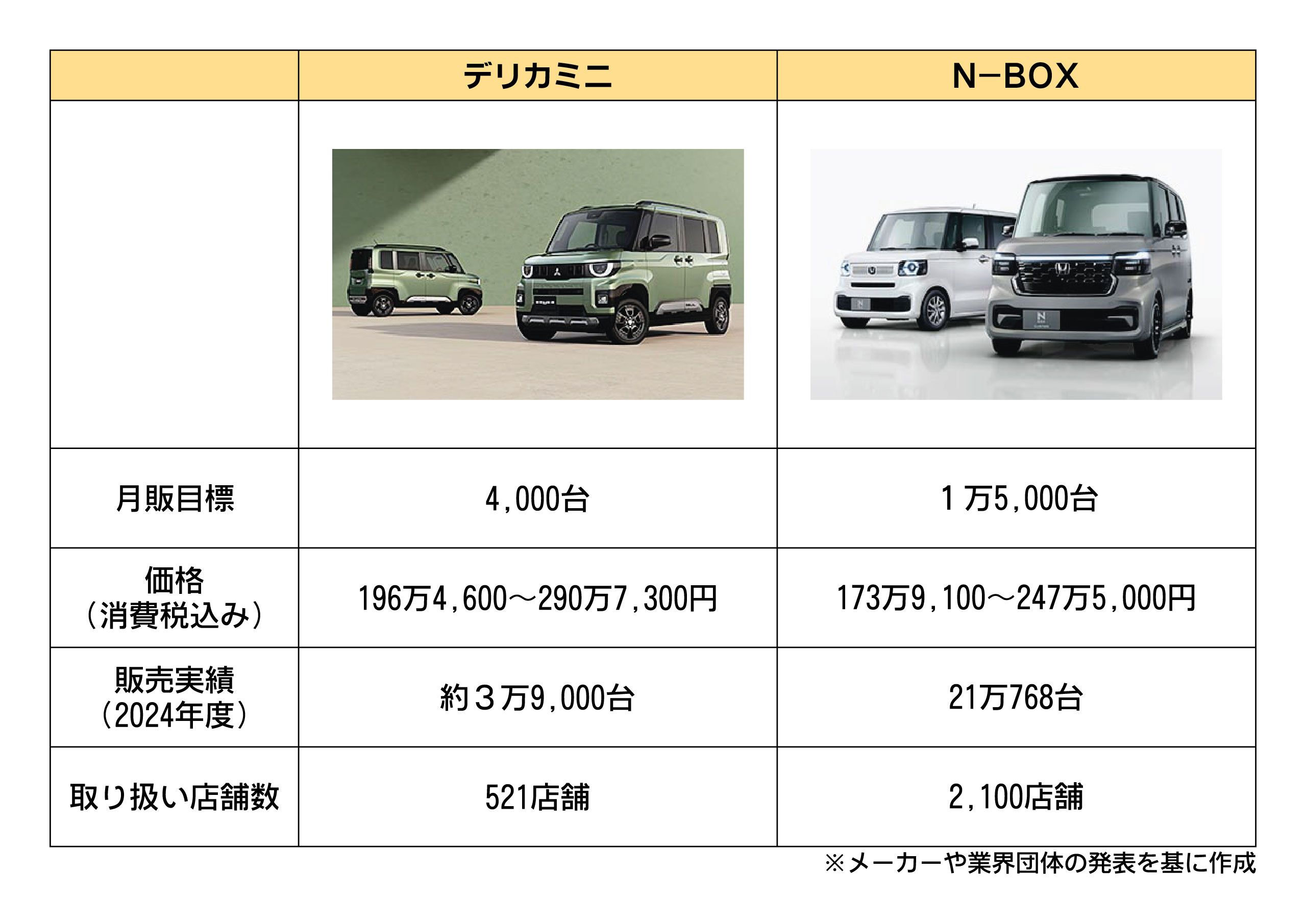一方のN―BOXは24年度に21万台超を販売し、登録車を含む国内販売で4年連続の首位を獲得。4万台に届かなかったデリカミニとは、大きな差がある。しかし、系列ディーラー1店舗当たりの販売効率で見ると、差は縮まる。ホンダは全国に2100店舗を構えるが、三菱自は521店舗(25年3月末時点)と少ない。単純計算では1店舗当たりの月販平均では約2台差となり、「もうひと踏ん張りで超えられる」と、同社の幹部は自信を見せる。