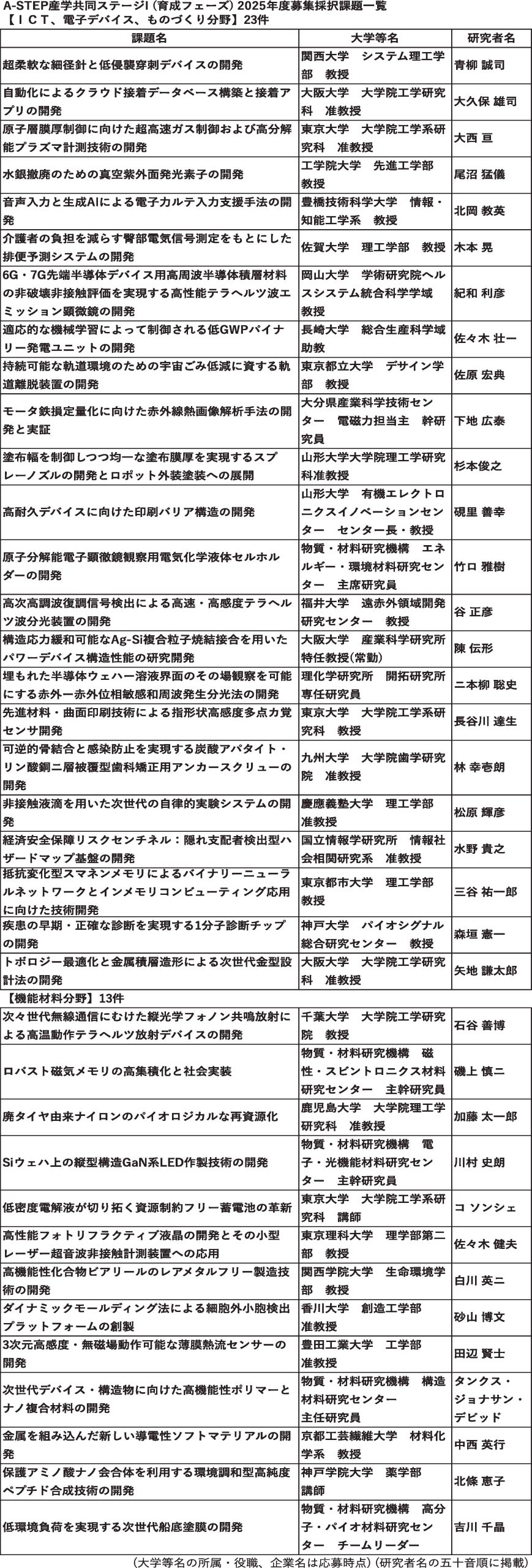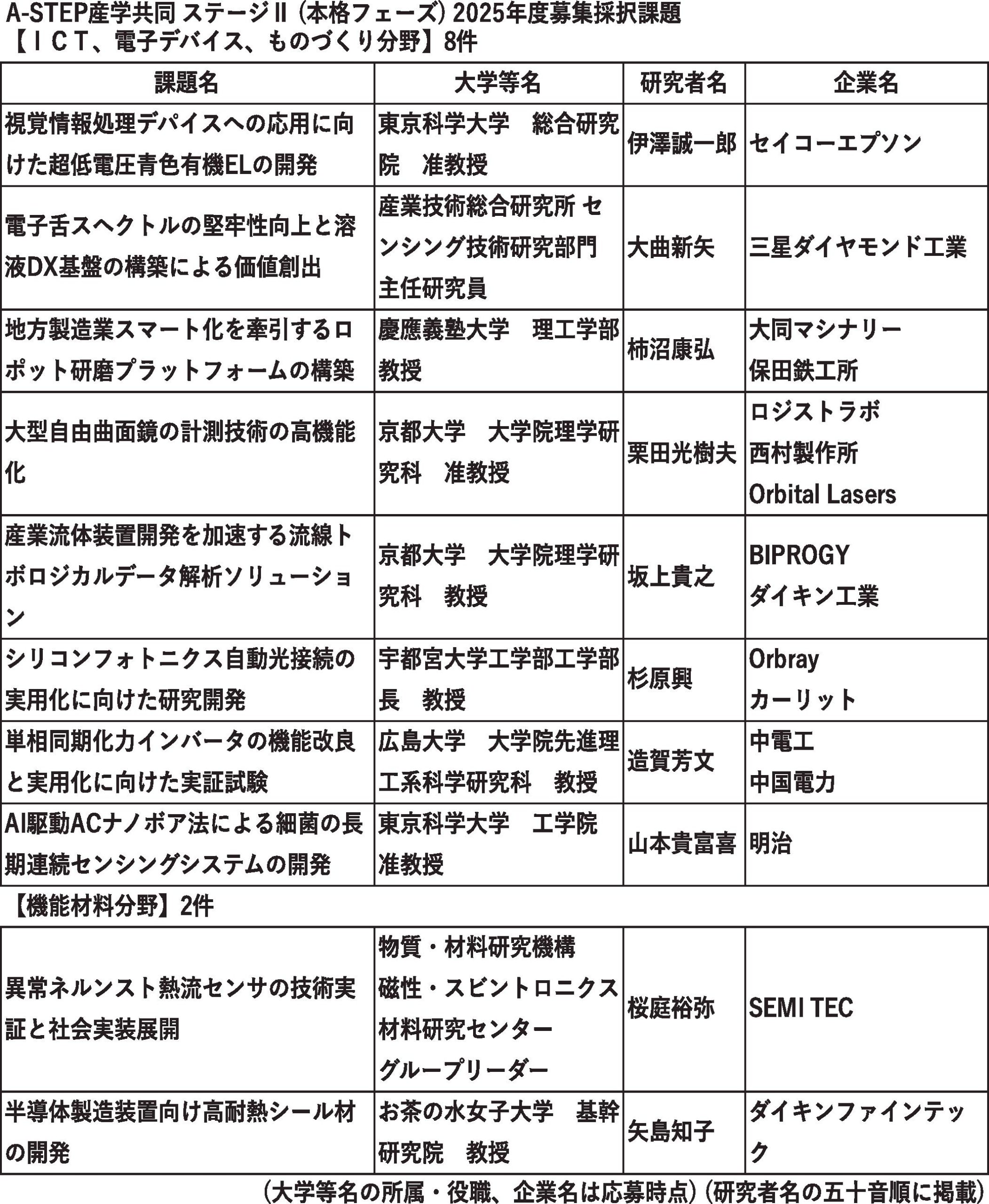 科学技術振興機構(JST、橋本和仁理事長)は、2025年度の「研究成果最適展開支援プログラム(A-STEP)産学共同」の採択課題を決定した。大学などの基礎研究の成果を磨き上げ「学」と「産」の共同開発体制の構築を目指す「ステージⅠ(育成フェ...