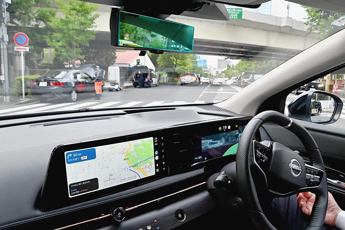 「今日は複雑で難しいルートを走る。環境を言い訳にするのはナシだ」。日産のソフトウェアデファインドビークル開発本部AD/ADAS先行技術開発部の飯島徹也部長はそう語り、「アリア」ベースの試作車に記者を招いた。11個のカメラで車体の周囲を360度検知し、英ウェイブ・テクノロジーズのAIが状況を予測・判断してクルマを動かす。5個のセンサーで周辺の物体との距離を掴むほか、ルーフ上のLiDAR(ライダー、レーザースキャナー)1基は、高速道路や夜間のアクシデント回避に使う。