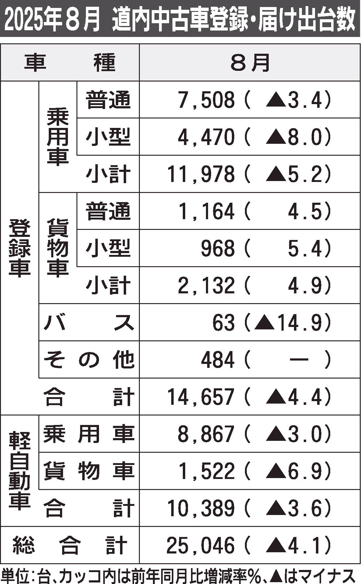 8月の道内中古車登録・届け出台数は、2万5046台(前年同月比4.1%減)で、登録車、軽自動車ともに2カ月連続で前年同月の台数を下回った。 日本自動車販売協会連合会の中古車登録台数と全国軽自動車協会連合会の軽自動車中古車販売台数をまとめた...