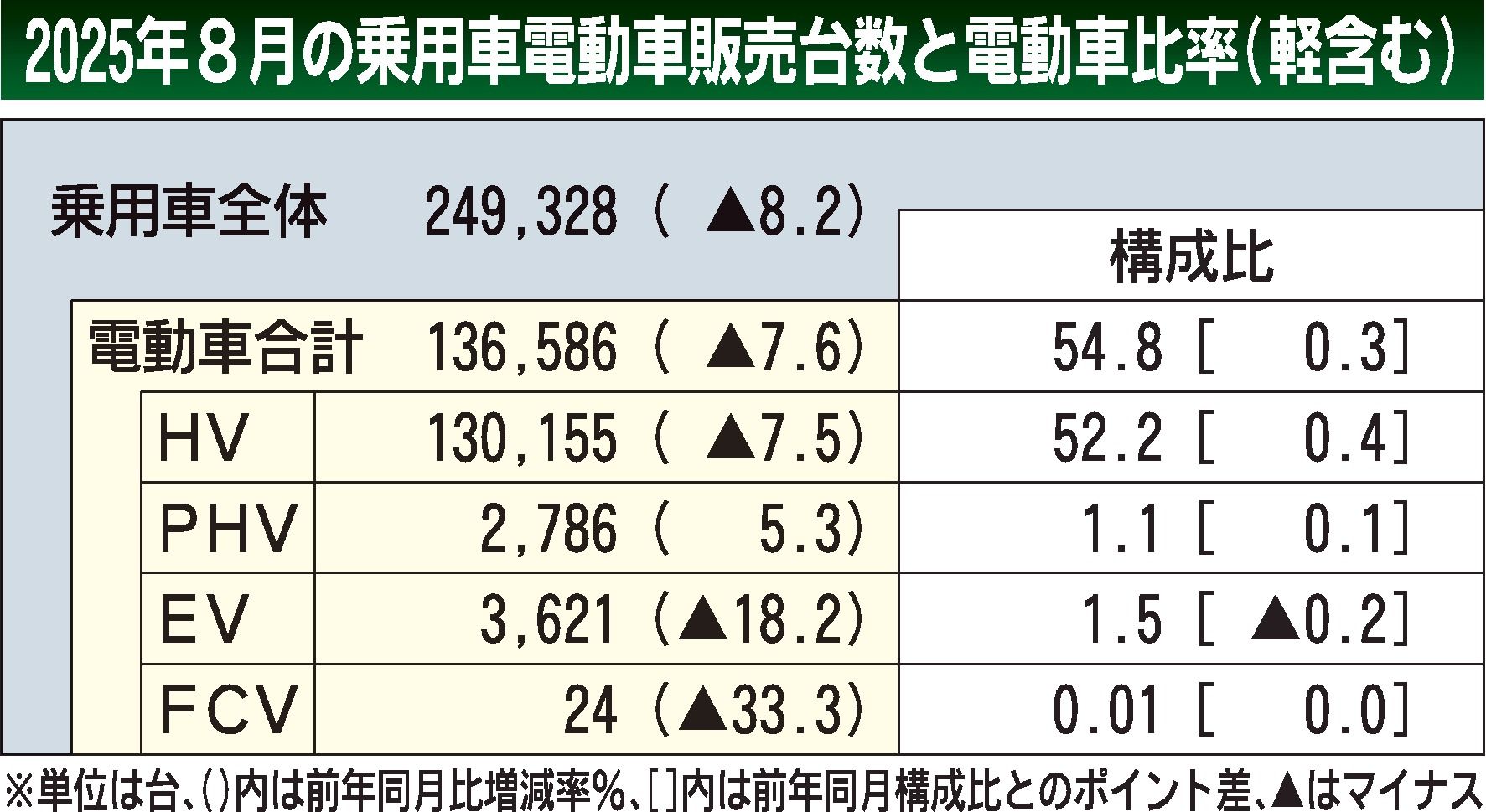 8月の国内電動車販売台数(乗用車)は、前年同月比7.6%減の13万6586台となり、2カ月連続で前年実績を下回った。商品切り替えの影響などで乗用車市場(同8.2%減)そのものが落ち込み、電動車販売も低迷した。乗用車市場に占める電動車比率は...