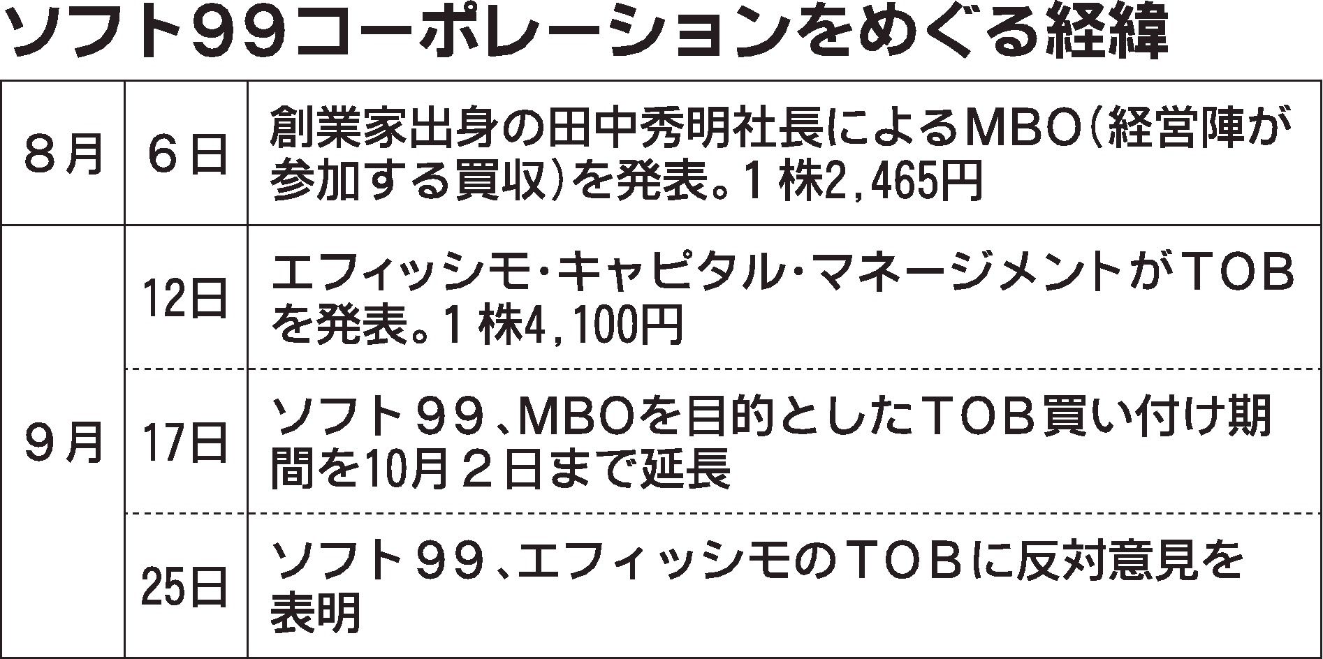 ソフト99コーポレーションの田中秀明社長は、日刊自動車新聞のインタビューに応じ、旧村上ファンド出身者が設立した投資ファンド「エフィッシモ・キャピタル・マネージメント」がTOB(株式公開買い付け)で対抗していることについて「MBO(経営陣が...