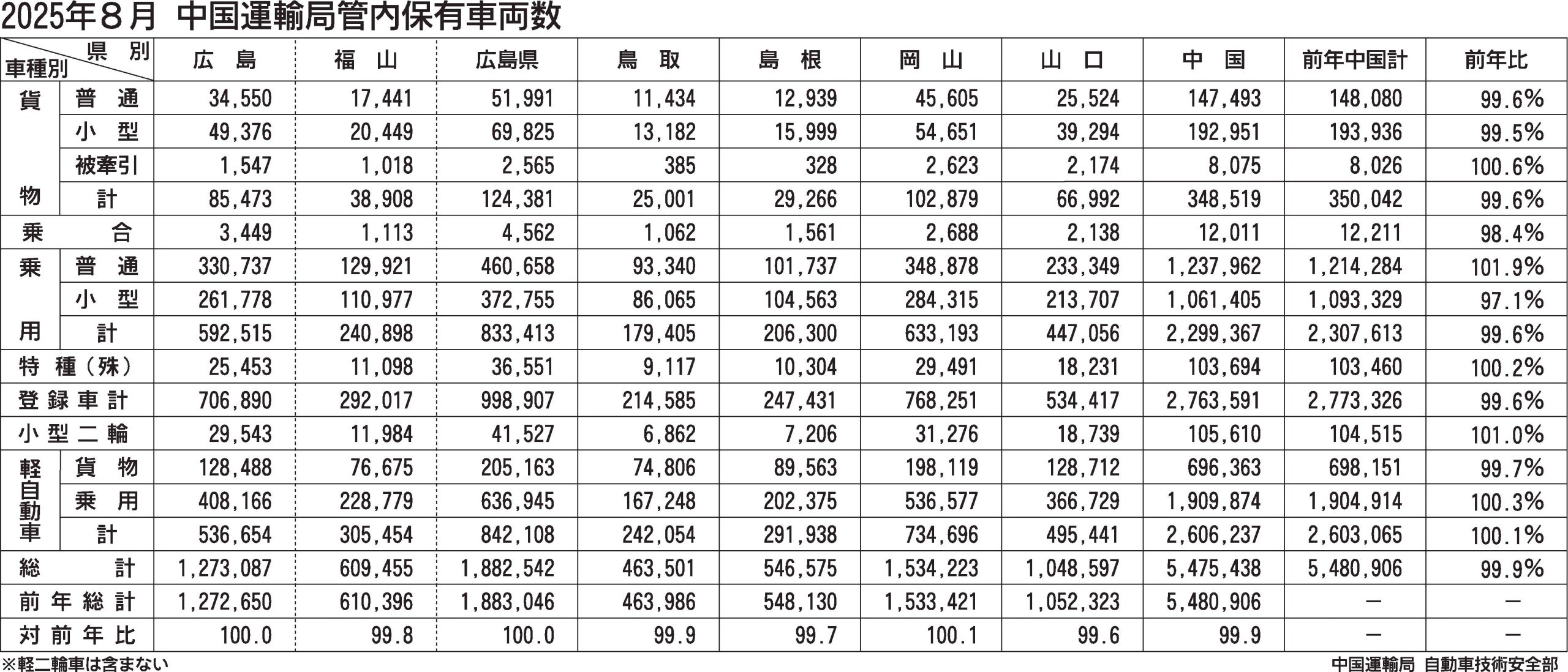 〈2025年8月中国運輸局管内保有車両数〉