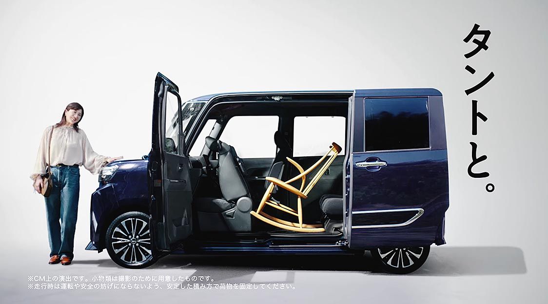 CM総研は、今回の注目CMに2020年4月度以来、5年5カ月ぶりに自動車業類首位を獲得したダイハツ「タント」を選んだ。9月度に放映された3作品の1つが、吉高由里子がインテリアショプで〝一目ぼれ〟したロッキングチェアを購入する新作。そのCMではチェアを車に運ぶ店員が「(車内に)入るかなあ」と心配するも、吉高が「入るんだなあ」と応じ、大きく開いたスライドドアから楽々とチェアが積み込まれるシーンを描いた。「ミラクルオープンドア」のテロップとともに、スライドドアの開放感と室内空間の広がりを印象的にアピールした。