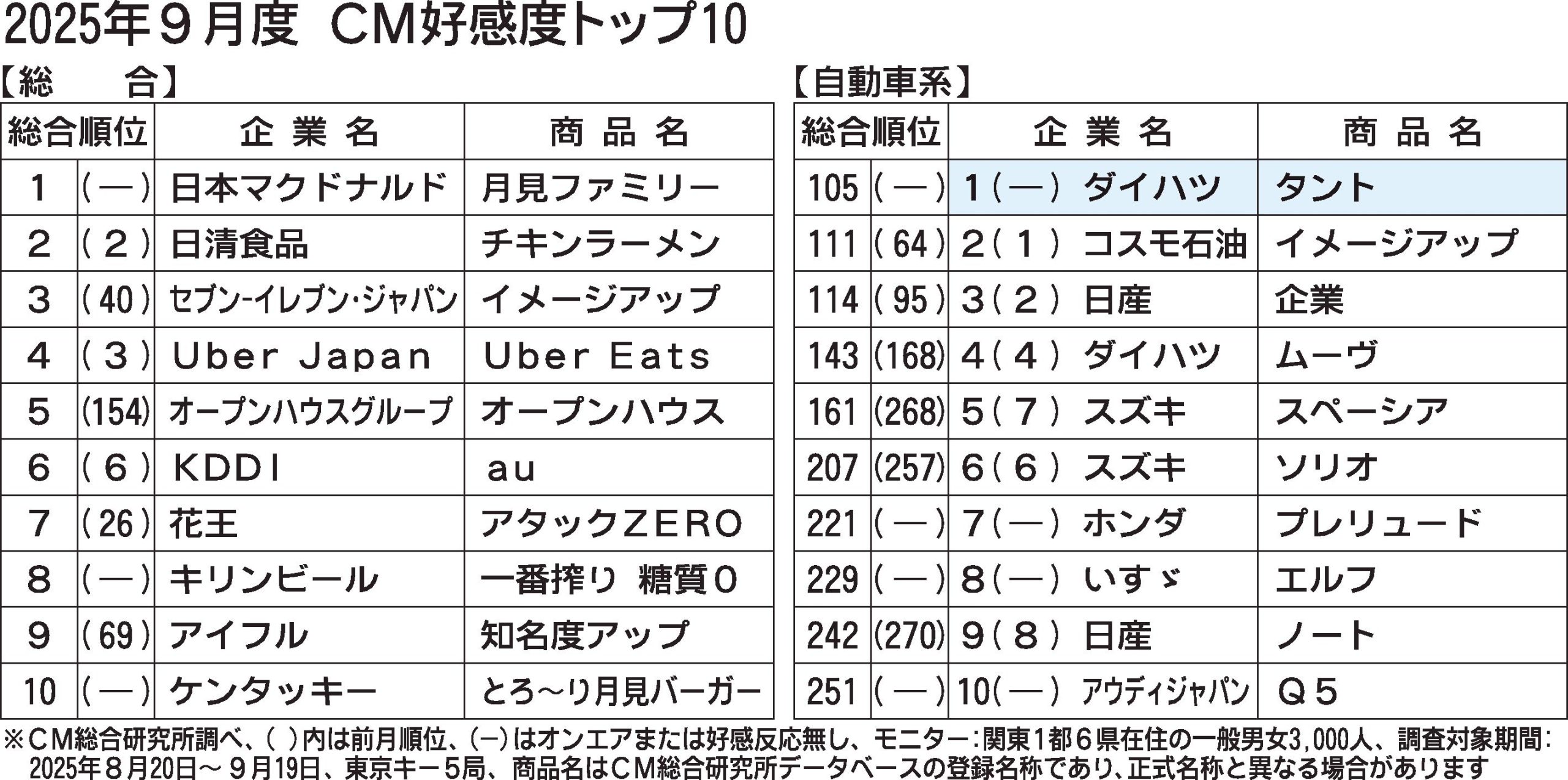 CM総合研究所(関根心太郎代表、東京都千代田区)は、2025年9月度のCM好感度ランキングを公表した。総合ランキングで自動車業類は27カ月連続でトップテンを逃した。今回の対象期間の2025年8月20日~9月19日に放映された全CMは2502銘柄(前月比52銘柄増)。このうち自動車業類は62銘柄(同12銘柄増)だった。