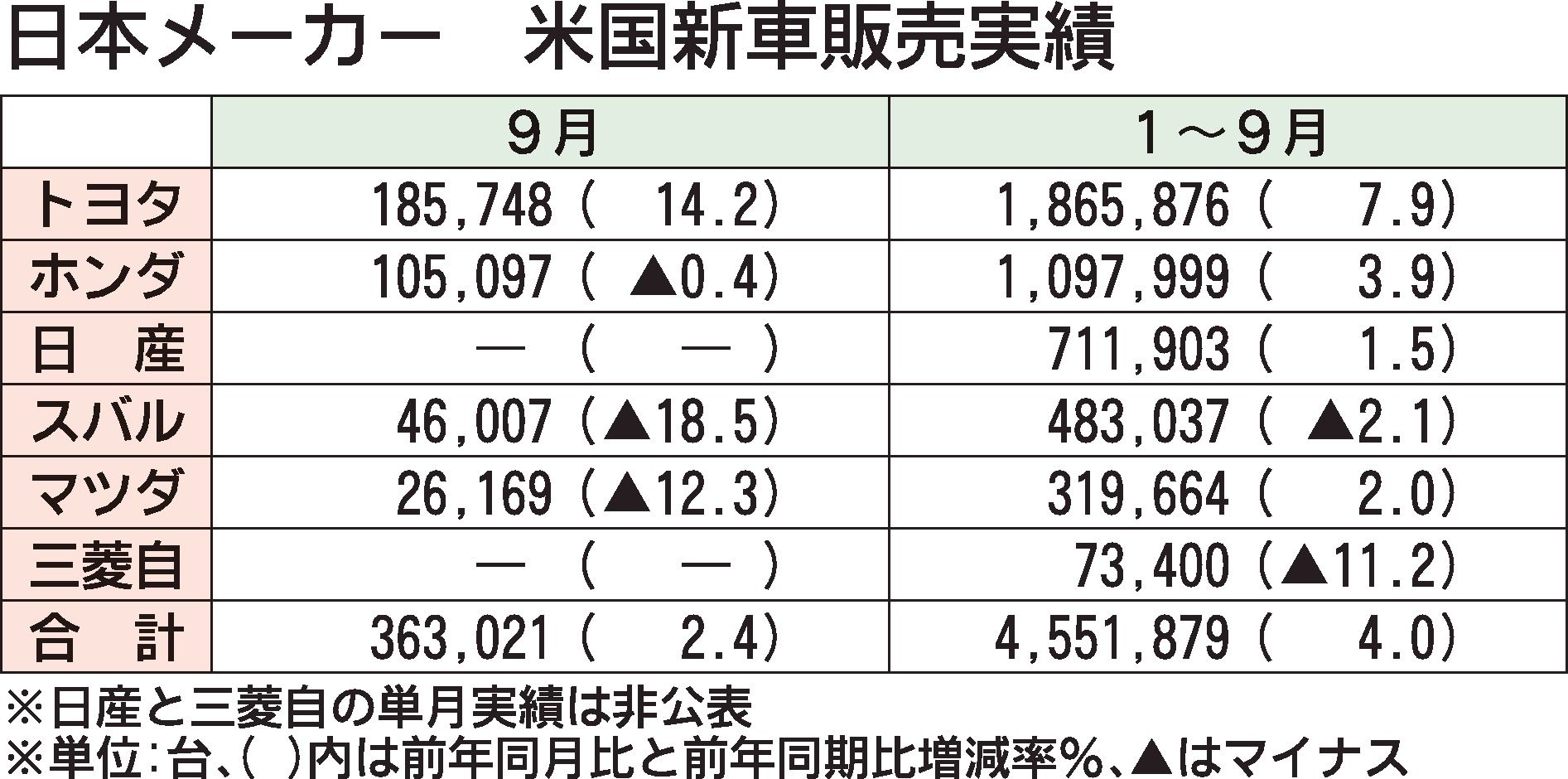 日本の自動車メーカー6社による1~9月の米国新車販売は前年同期比4.0%増の455万1879台だった。トヨタ自動車やホンダが電動車需要を追い風に販売を伸ばし、日産自動車もSUVを中心に販売が好調だった。一方、スバル、三菱自動車の2社は前年割れだった。9月は公表している4社中、トヨタを除く3社が前年同月実績を下回った。