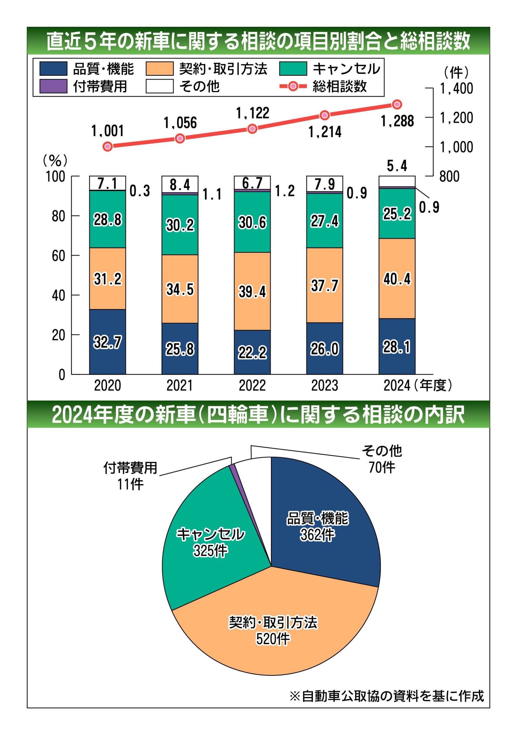 新車の不適切な販売方法に関する消費者からの相談が増加している。自動車公正取引協議会(自動車公取協、鈴木俊宏会長)がまとめた2024年度版の「消費者相談レポート」によると、新車の総相談件数は前年同月比6.1%増の1288件となり、4年連続で...