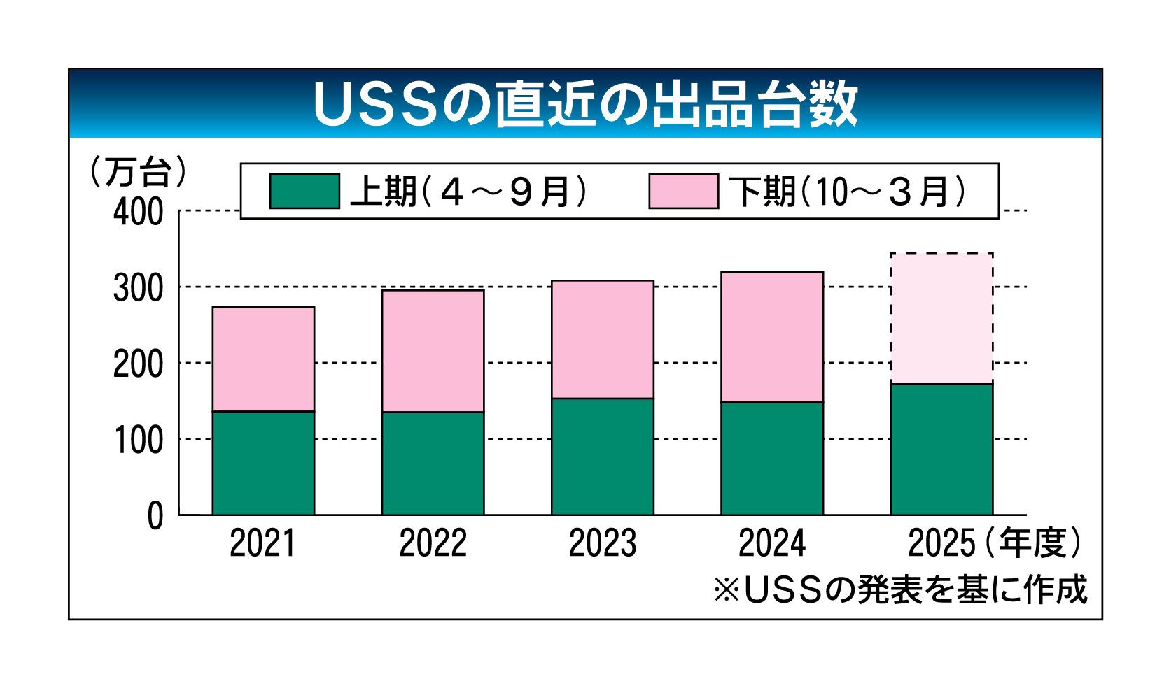 ユー・エス・エス(USS)の中古車オークション(AA)の出品台数が、2025年度も4年連続で過去最高を更新する可能性が高まっている。上期(4~9月)の出品台数は、前年同期比15.9%増の172万4682台。24年度の320万2002台を超...