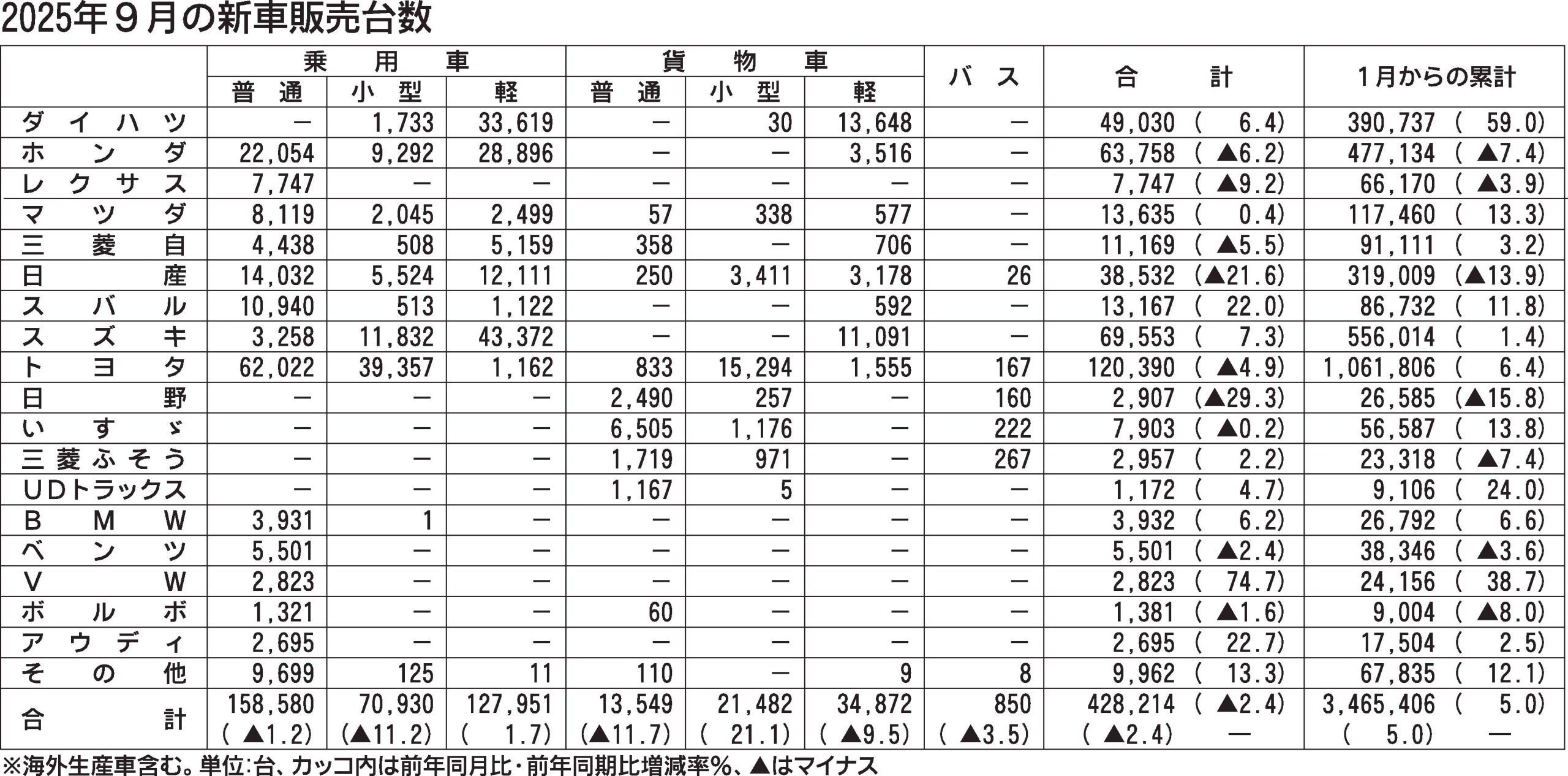 〈2025年9月地域別新車販売(含む軽自動車、海外生産車)〉