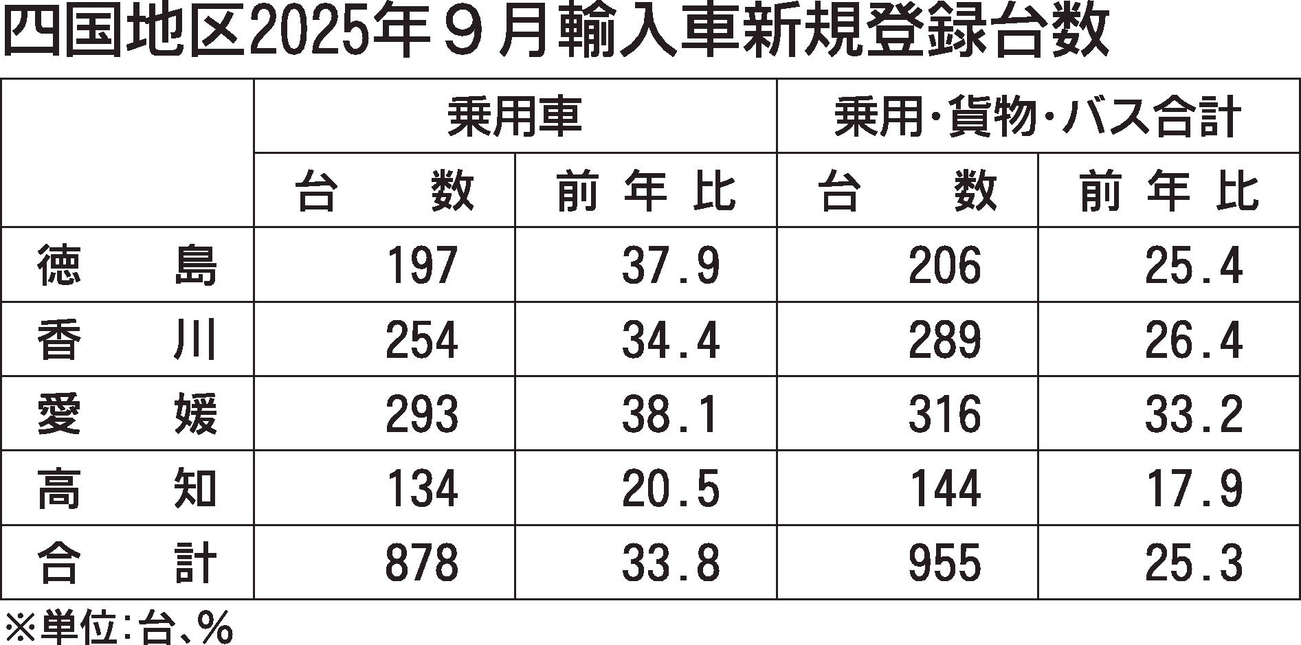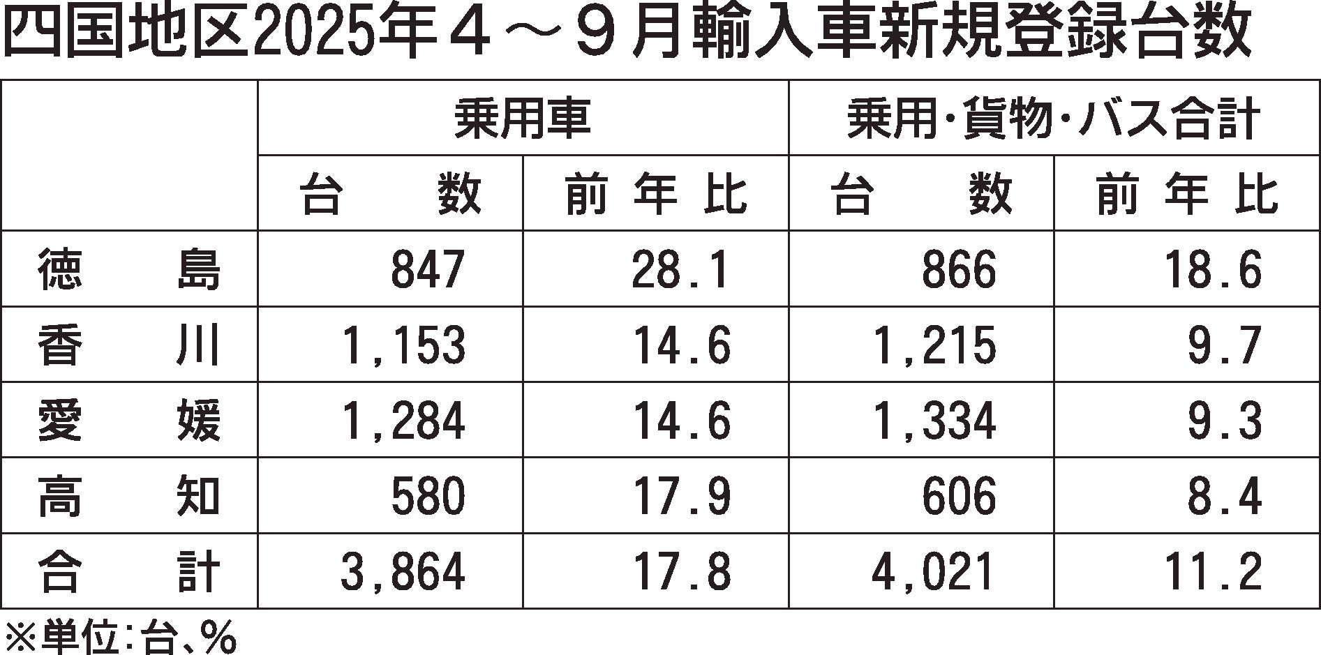 日本自動車輸入組合(JAIA)の発表によると、2025年度上期(4~9月)の四国地区の輸入車新規登録台数(外国メーカー車と日本メーカー車)は前年同期比11.2%増の4021台と大幅に伸長した。四国4県すべてで前年実績を上回り、外国メーカー...