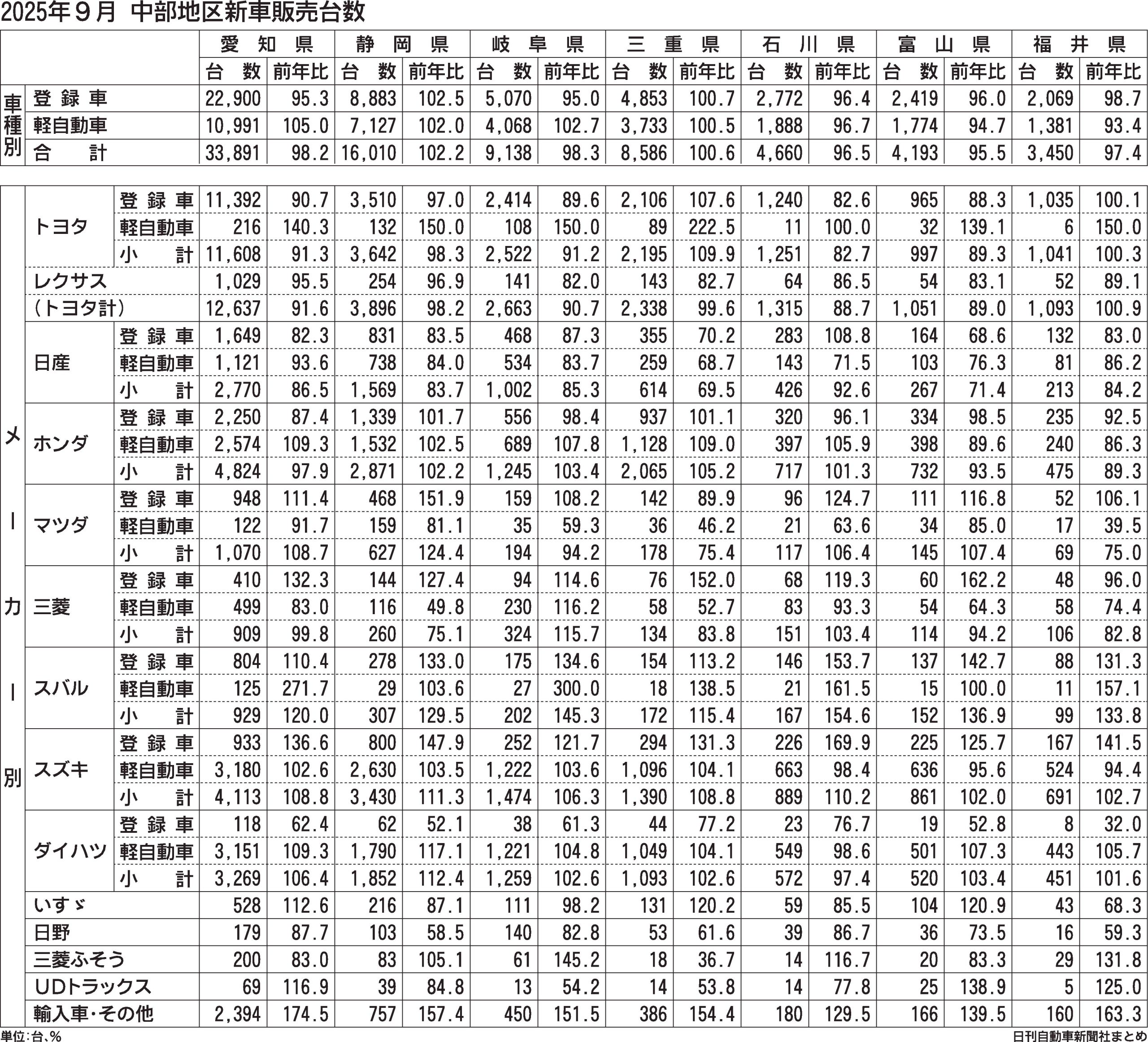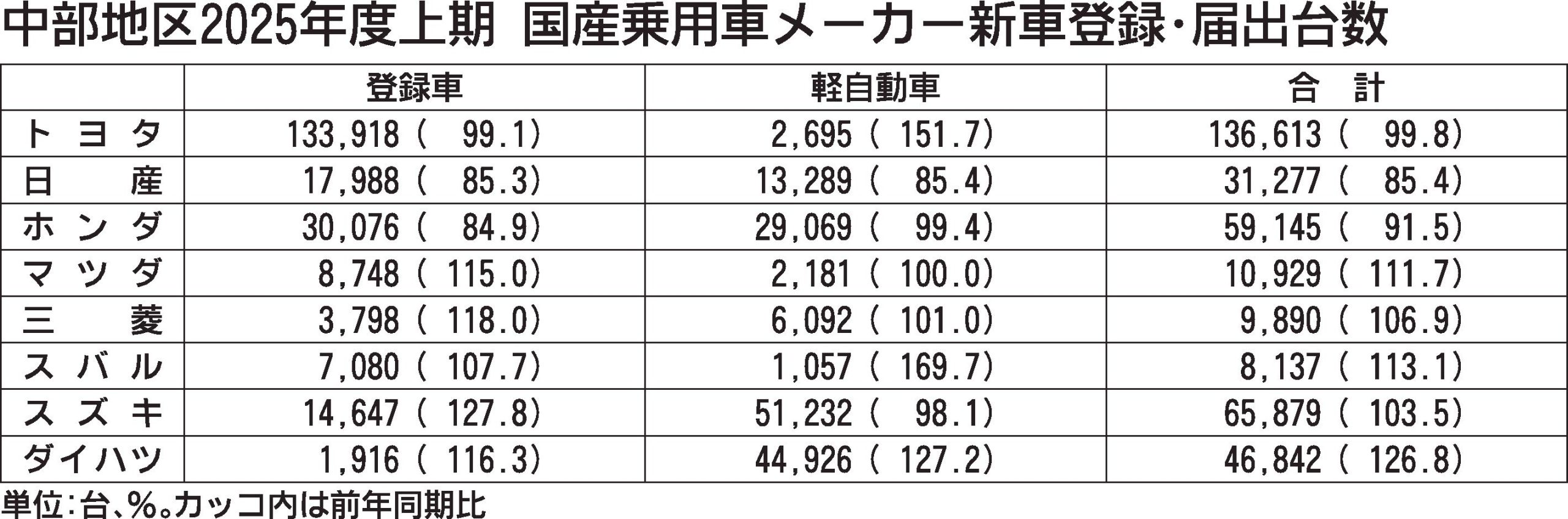 日刊自動車新聞がまとめた2025年度上期(4~9月)の中部地区7県(愛知、静岡、岐阜、三重、石川、富山、福井)の新車登録台数は、前年同期比1.2%増の40万1063台だった。一連の認証不正からの回復が著しいダイハツが各県で躍進した。一方で...