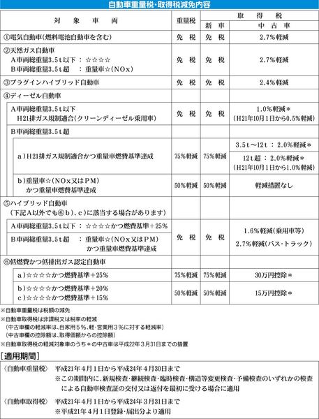 ハイブリッド車(HV)や電気自動車(EV)などの低炭素車(エコカー)を対象に自動車重量税と自動車取得税を減免するエコカー普及促進税制が4月1日にスタートした。日刊自動車新聞が国土交通省公表の「自動車の燃費性能」(5月1日現在)に基づき減免...