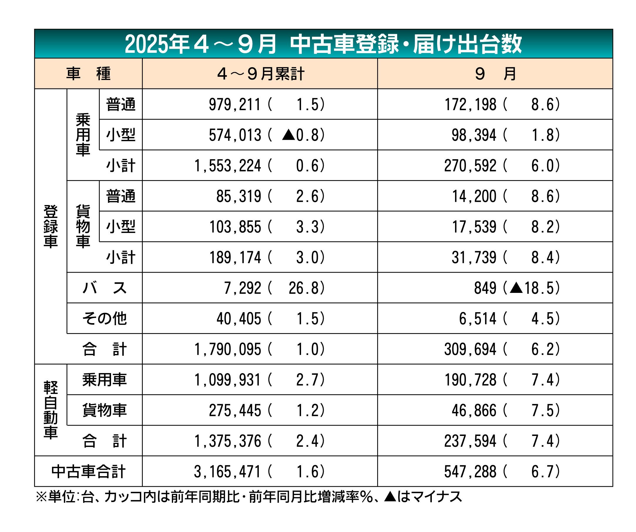 2025年9月の中古車登録・届け出台数、前年比6.7%の54万7288台 2カ月ぶり増