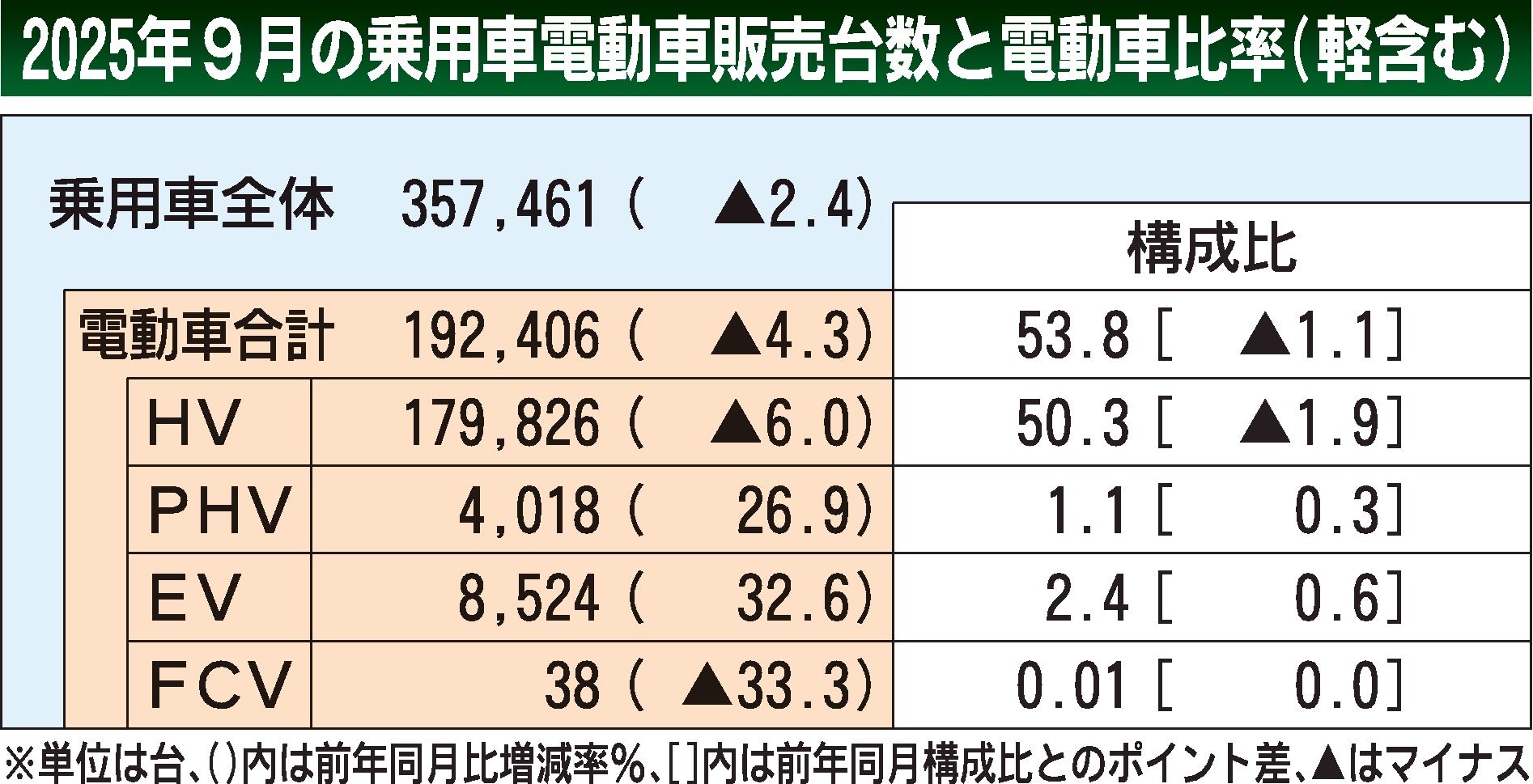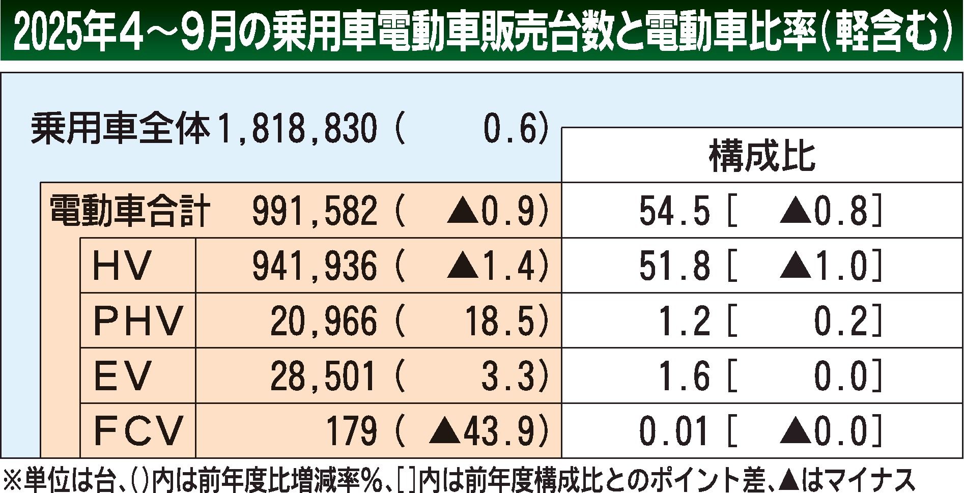2025年度上期(4~9月)の国内電動車販売(乗用車)は99万1582台(前年同期比0.9%減)となり、わずかながら上期として5年ぶりに前年実績を下回った。電動車比率も前年より0.8ポイント低い54.5%だ。電動車の約9割を占めるハイブリ...