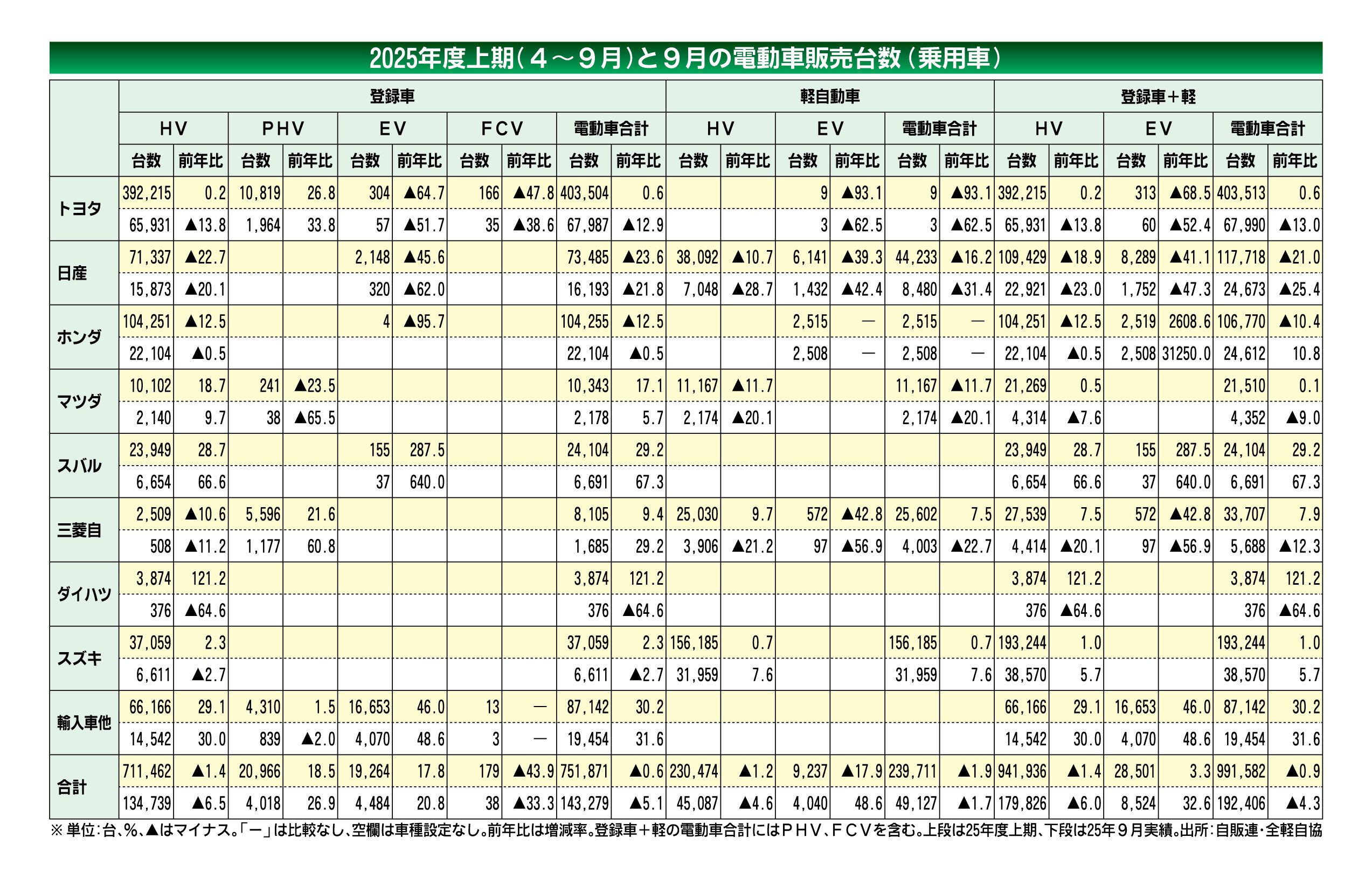 〈2025年度上期(4~9月)と9月の電動車販売台数(乗用車)〉