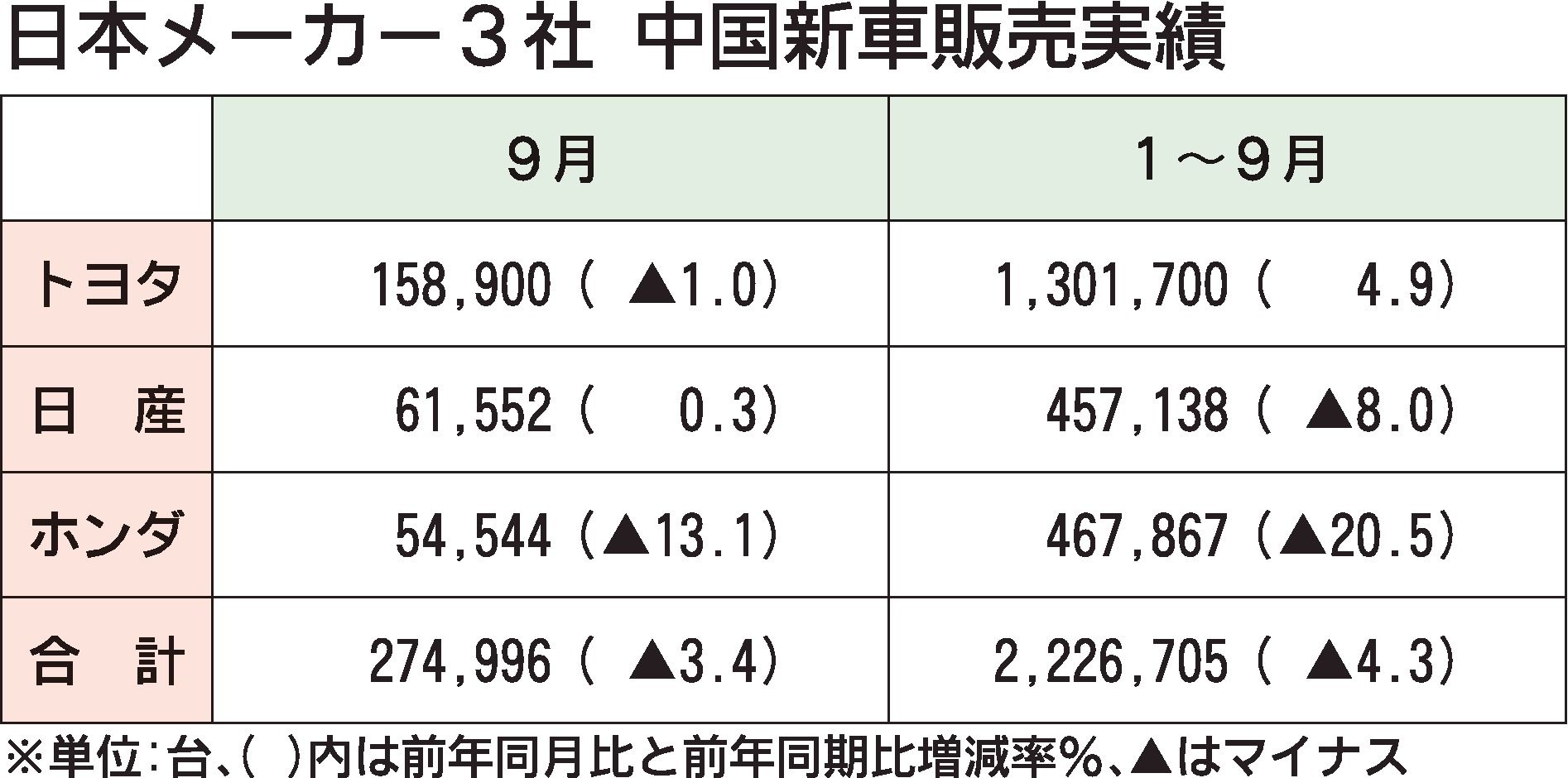 日本の自動車メーカー3社による9月の中国新車販売は前年同月比3.4%減の27万4996台で、前年実績を3カ月ぶりに下回った。激しい値引き競争に加え、買い替え補助金の終了などが影響したとみられる。 トヨタ自動車は15万8900台(同1.0%...