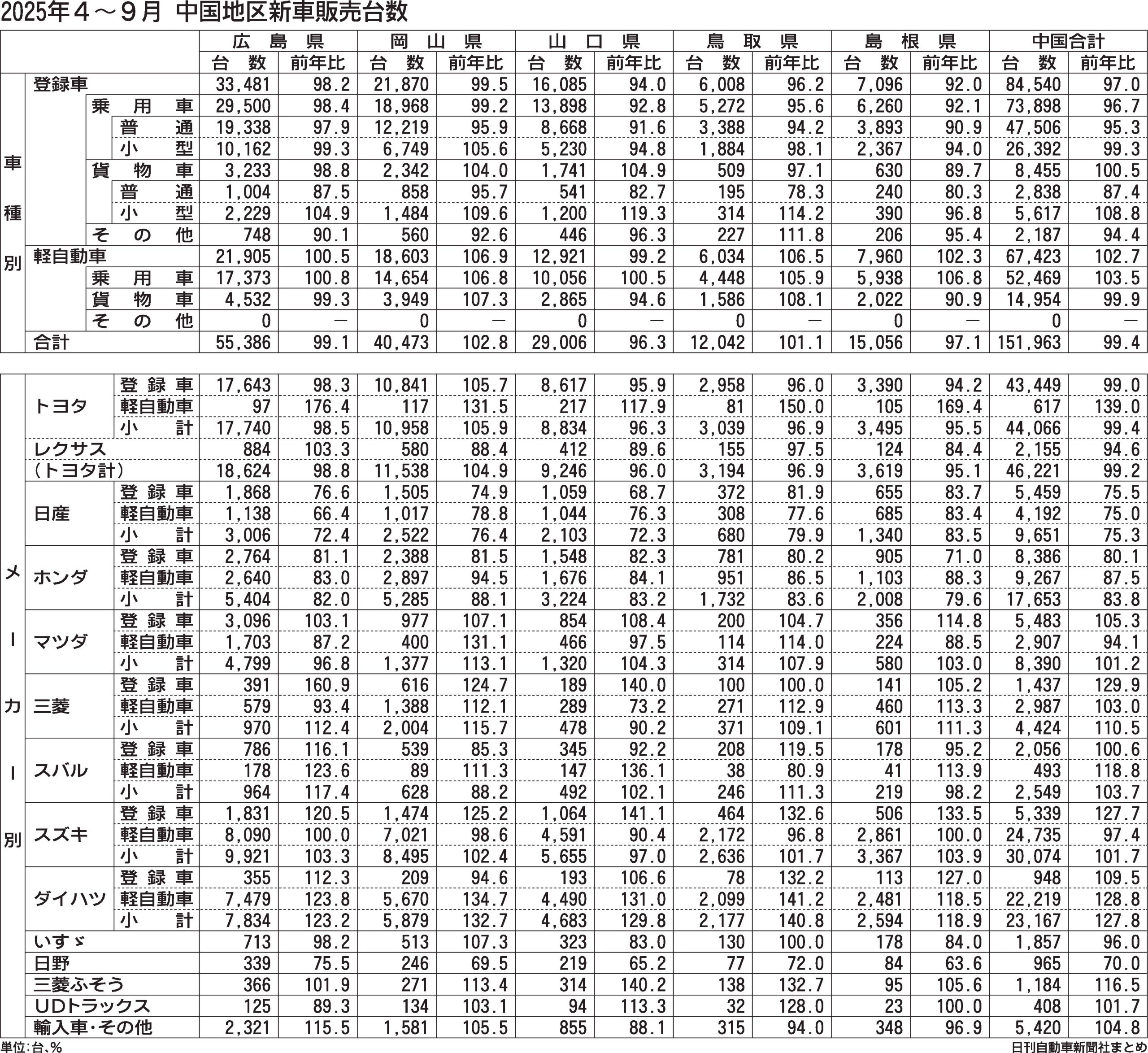 2025年上期(4~9月)の中国地区新車販売台数は、前年同期比0.6%減の15万1963台だった。ほぼ前年並みの市場規模だったが、前年台数を上回った全国市場に対し1.1ポイント低く、2年連続で前年台数を下回った。ダイハツ工業の認証不正によ...