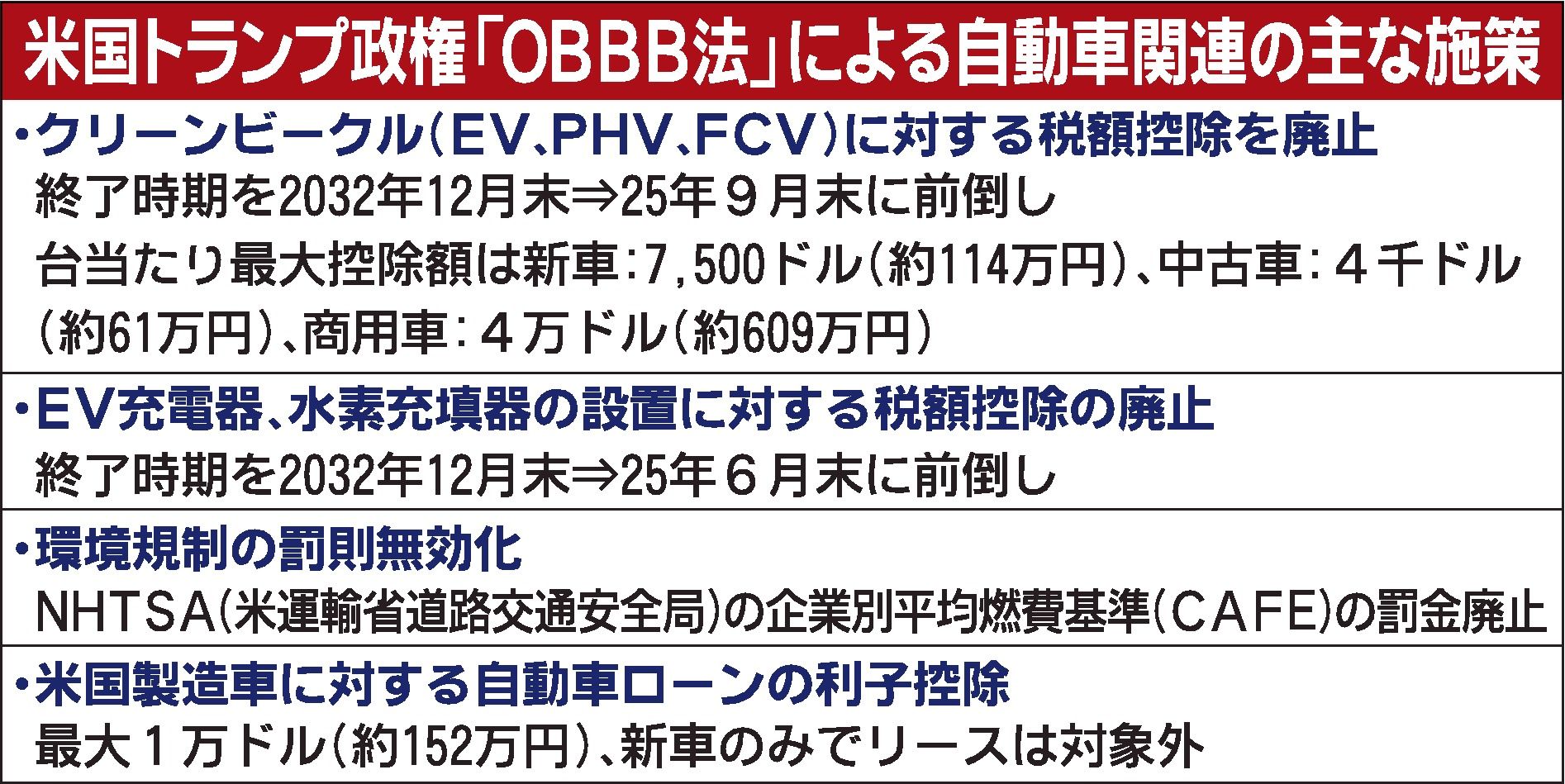 トランプ米大統領肝いりの予算調整措置法「1つの大きな美しい(OBBB)法案」は、バイデン前政権が進めた再生可能エネルギー推進策からの転換を図っており、自動車関連では電気自動車(EV)などへの税額控除が廃止された。対象は乗用EVの新車だけで...