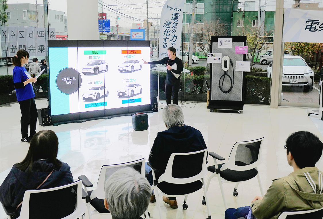 ネッツトヨタ道都(内間木忠行社長)は25、26日の2日間、9日に一部改良して発売した電気自動車(EV)専用車の新型「bZ4X」の試乗会を本社・中央店(中央区)で開催した。多くの来場者をショールームに集め、初日はbZ4Xの試乗件数が30件近...