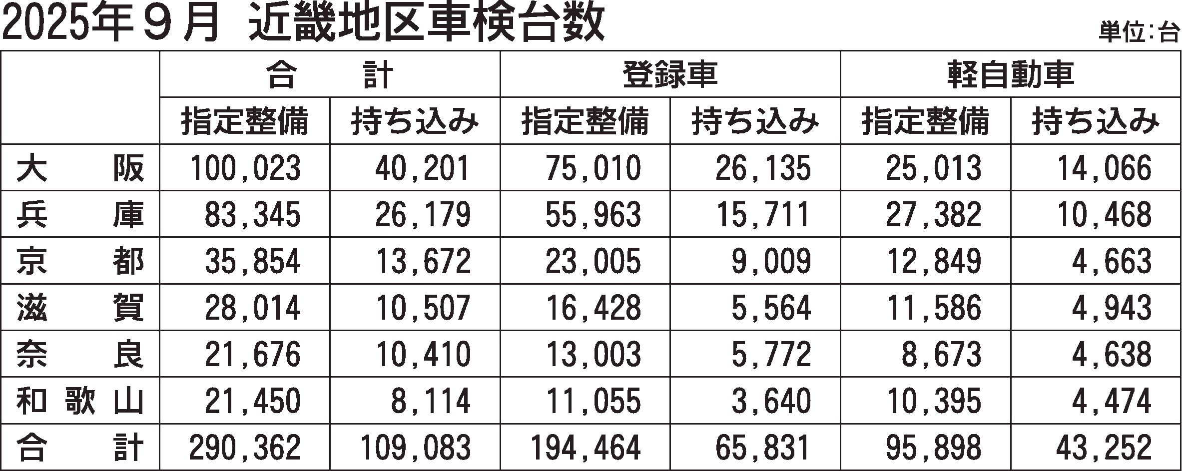 近畿2府4県の9月の継続検査(車検)台数(軽自動車を含む)は、前年同月比5.5%増の39万9445台で、3カ月ぶりに前年を上回った。登録車は同4.5%増の26万295台で3カ月ぶりの前年超え、軽は同7.3%増の13万9150台で2カ月ぶり...