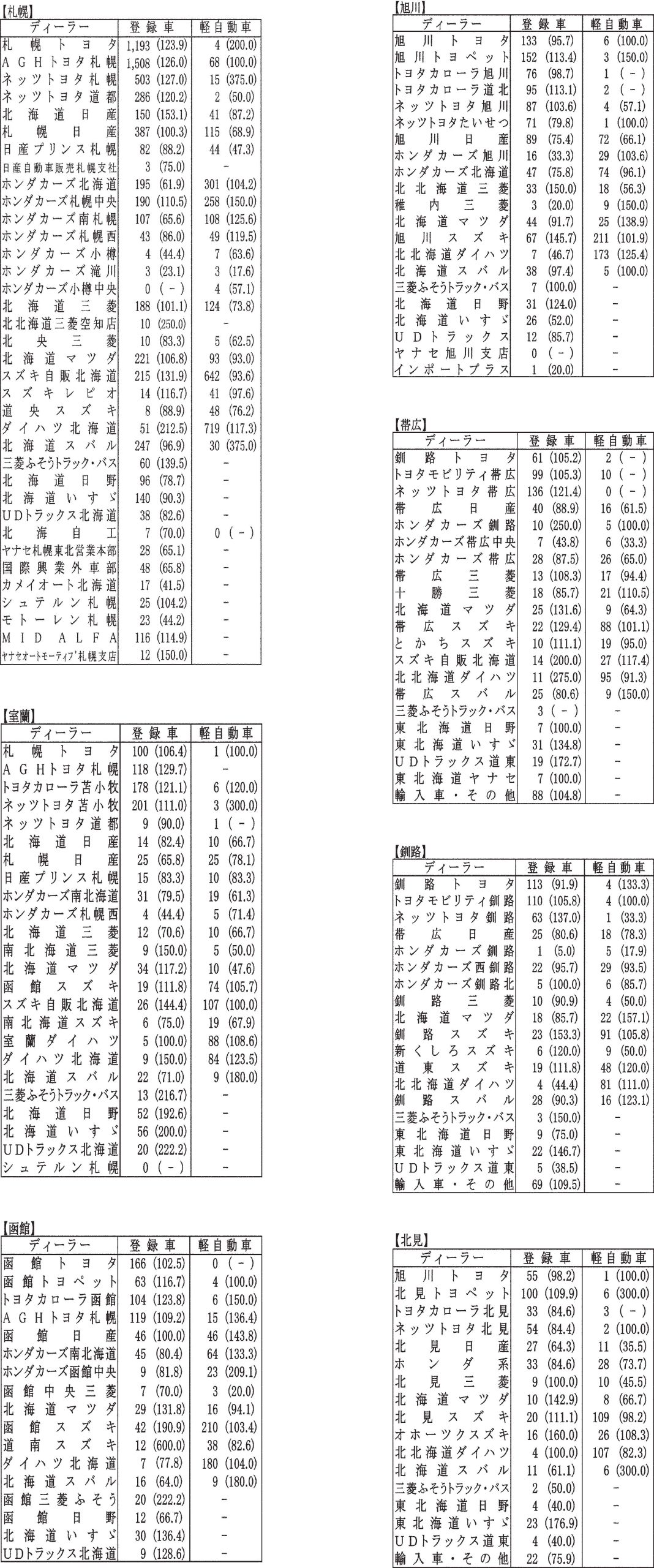 〈9月度全道管内別ディーラー別新車登録・届け出台数(カッコ内は前年同月比)〉札幌管内ホンダ系・スズキ系の登録台数は自販連正会員分