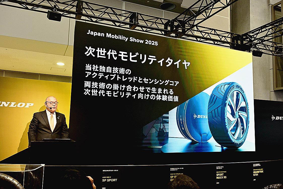住友ゴム工業は、長期経営戦略「ライズ2035」を具現化した独自技術として「アクティブトレッド」と「センシングコア」をかけ合わせた次世代タイヤの未来像を訴求した。 走行する路面環境の変化に対応して、タイヤゴムの性質を変化させる技術を、イメー...