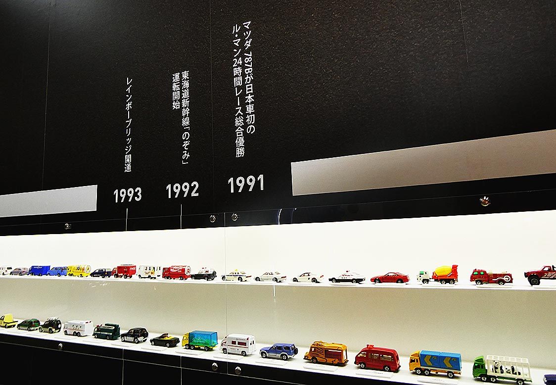 2025年に55周年を迎えたトミカ。ブースでは1970年に発売された初代トミカ6台をはじめ、最新のトミカまで年代別に展示されていた。約300台のトミカと一緒に、それぞれの時代に起きた自動車に関わる出来事や情報を描いた壁画も用意した。壁画に...