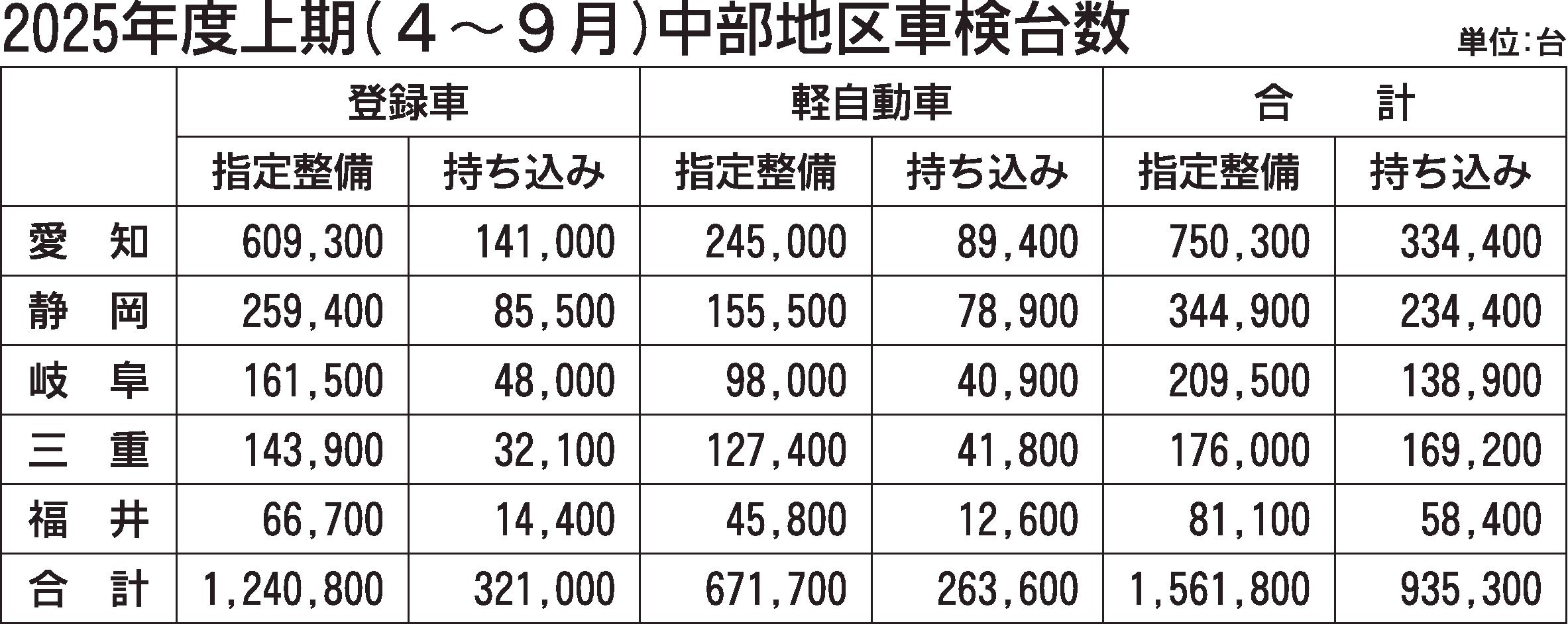 中部地区2025年度上期(4~9月)の継続検査(車検)台数(登録車+軽自動車)は、前年同期比3.2%増の249万7100台だった(中部運輸局自動車技術安全部調べ)。上期としては2年ぶりの増加だ。登録車は同2.2%増の156万1800台、軽...