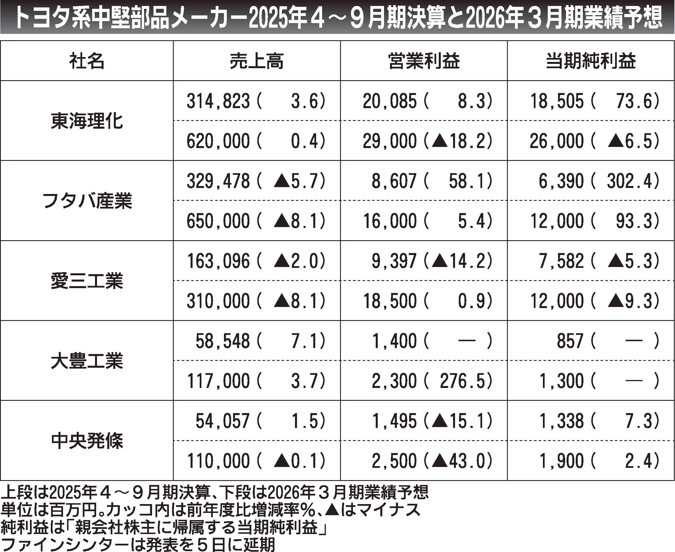 ファインシンターを除くトヨタ自動車系中堅部品メーカー5社が発表した2026年3月期の通期業績予想は、トヨタの堅調な車両生産を受け、東海理化、フタバ産業、大豊工業が上方修正した一方、米国関税や為替の影響が不透明なことから、愛三工業と中央発條...