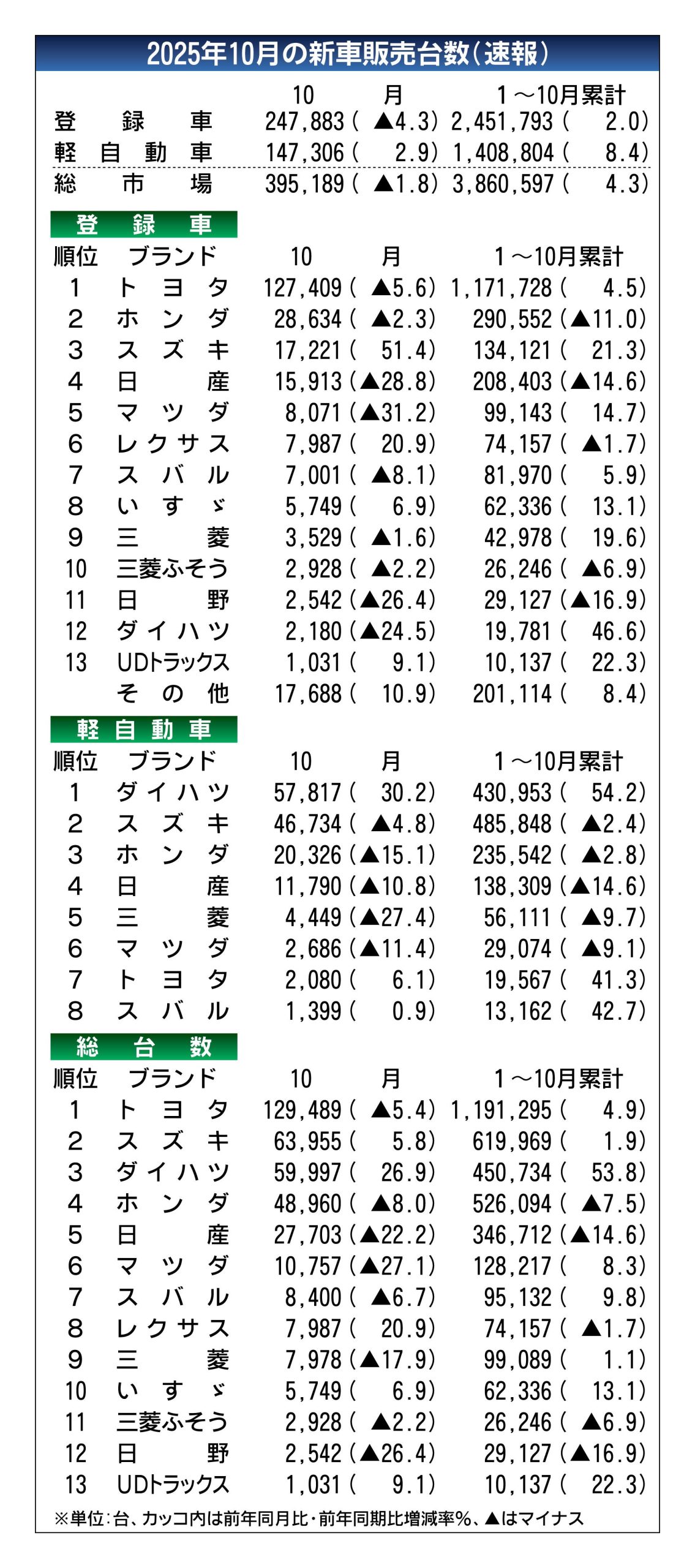 10月の新車販売で、ダイハツ工業が2023年12月以来、22カ月ぶりに軽自動車市場で首位に返り咲いた。認証不正の影響でスズキに水をあけられていたが、6月に発売した「ムーヴ」の新型車効果などで販売を伸ばした。10月の新車販売総数(登録車と軽...