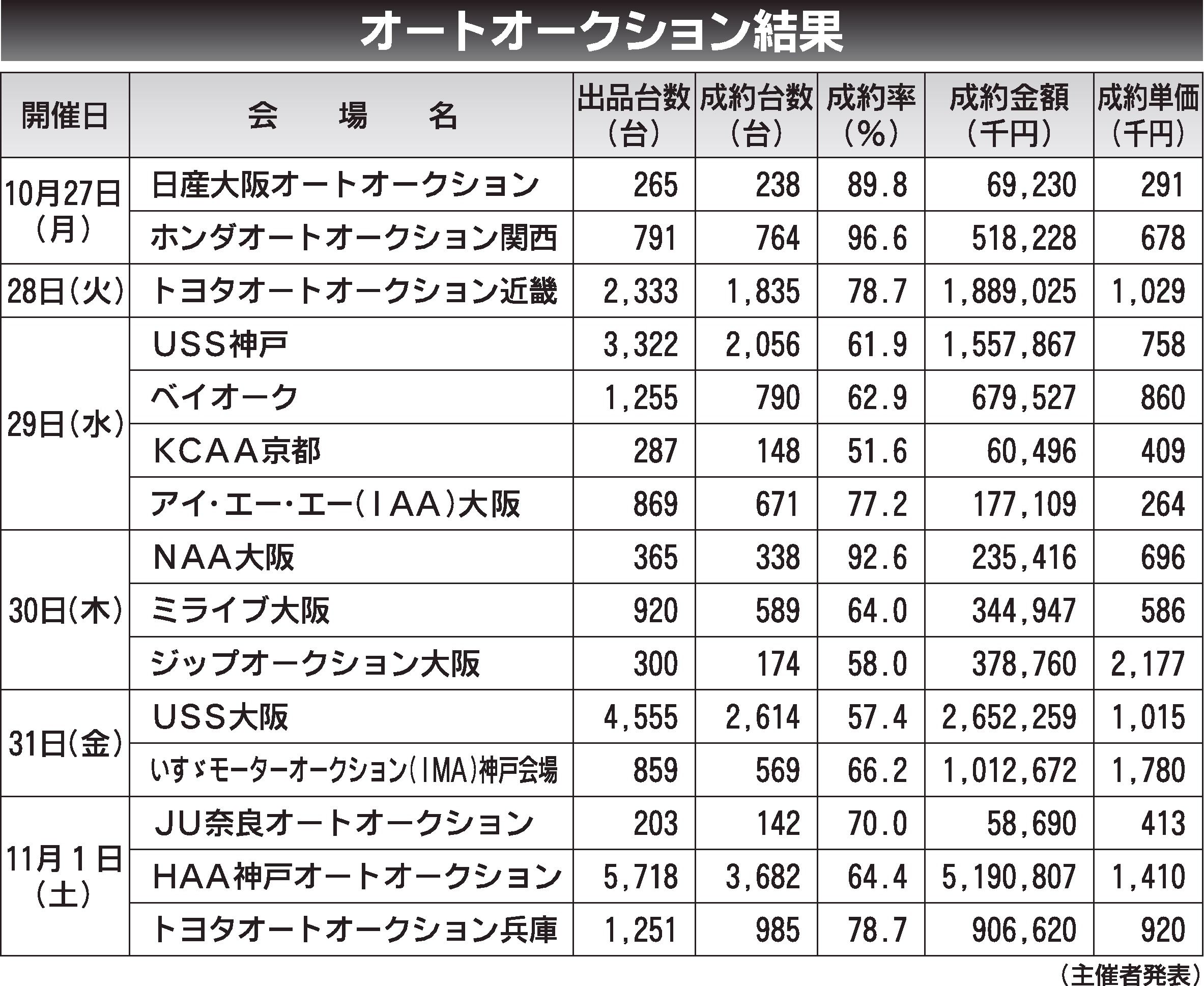 〈オートオークション結果〉近畿地区 2025/10/27~11/1