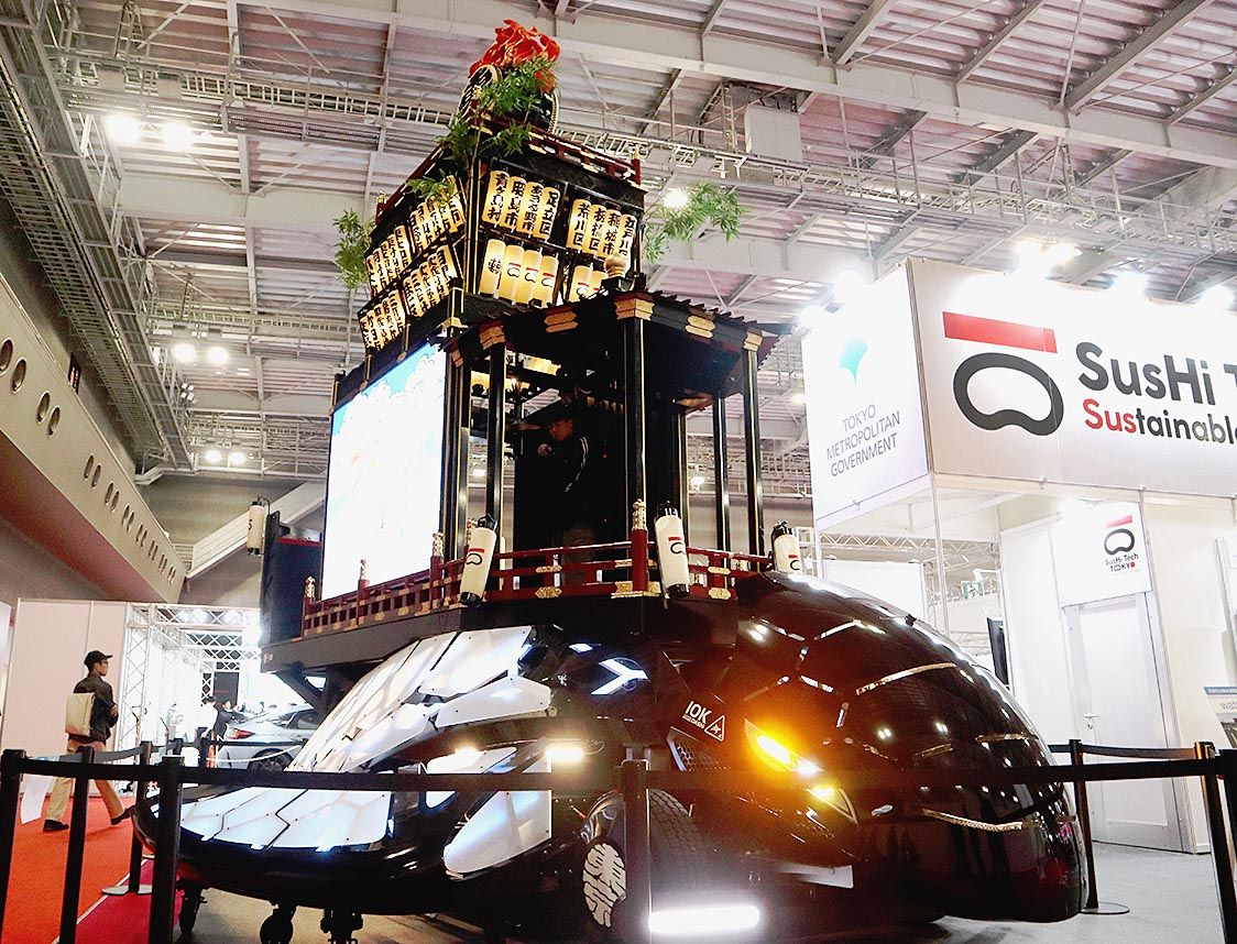 東京都スタートアップ戦略推進本部のブースにそびえ立つ、祭り櫓(やぐら)を背負った巨大なカメ型のモビリティ「ツナグルマ」。プロダクト開発企業のRDS(杉原行里社長、埼玉県寄居町)と、太鼓・神輿などの製造販売を行う宮本卯之助商店(宮本芳彦社長...