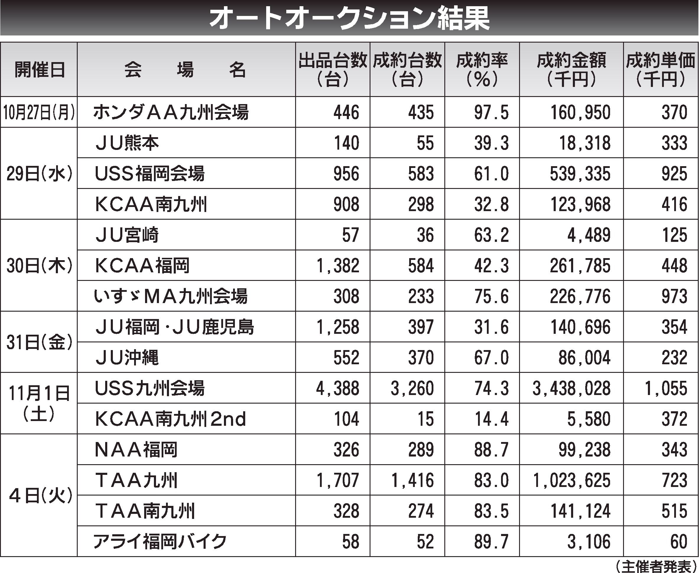 〈オートオークション結果〉九州地区 2025/10/27~11/4