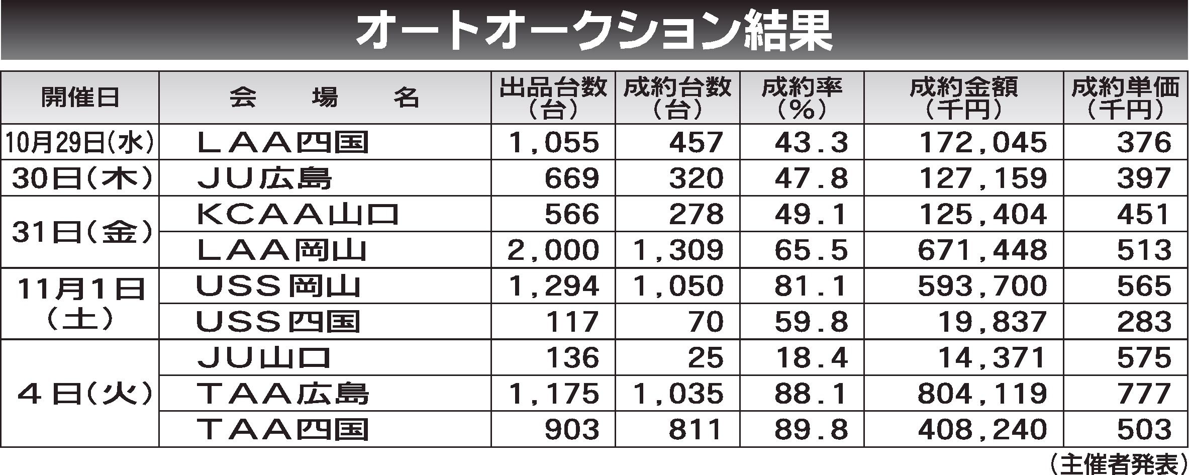 〈オートオークション結果〉中・四国地区 2025/10/29~11/4