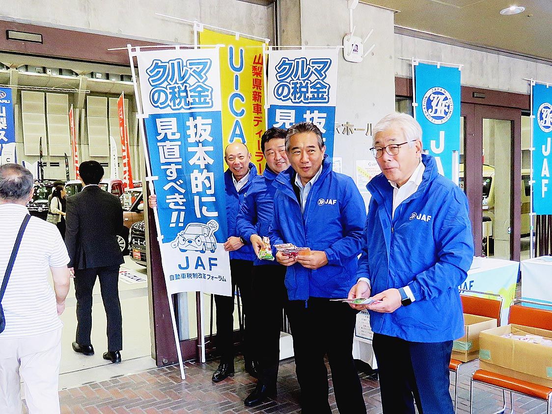【甲府】日本自動車連盟(JAF)山梨支部(佐々木宏明支部長)は、甲府市のアイメッセ山梨で「2026年度税制改正に関する要望活動」に取り組んだ。山梨県自動車販売店協会(佐々木宏明会長)主催のU―CARフェア会場口で実施し、チラシ300枚を配...