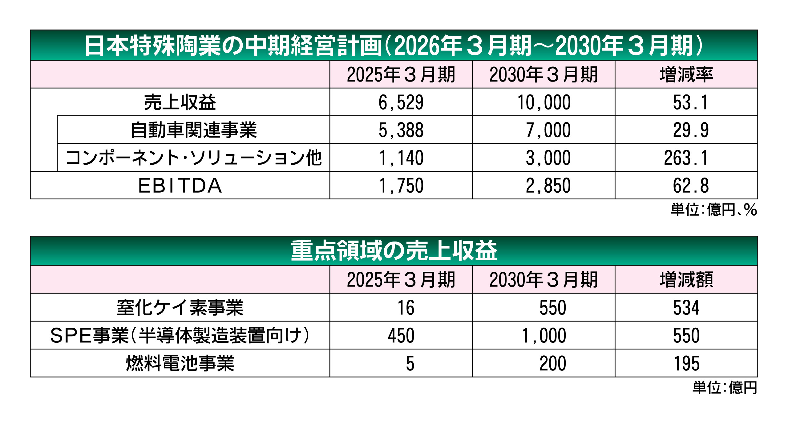 電動車関連では、軽量で熱伝導性や絶縁性に優れる窒化ケイ素事業に力を入れる。完全子会社したニテラマテリアルズとのシナジーを生かし、ベアリング用セラミックボールやパワー半導体向け放熱基板を国内外に展開していく。窒化ケイ素や半導体装置向け製品、燃料電池などを含むコンポーネント・ソリューションで、売上高を3千億円へと倍増させる。